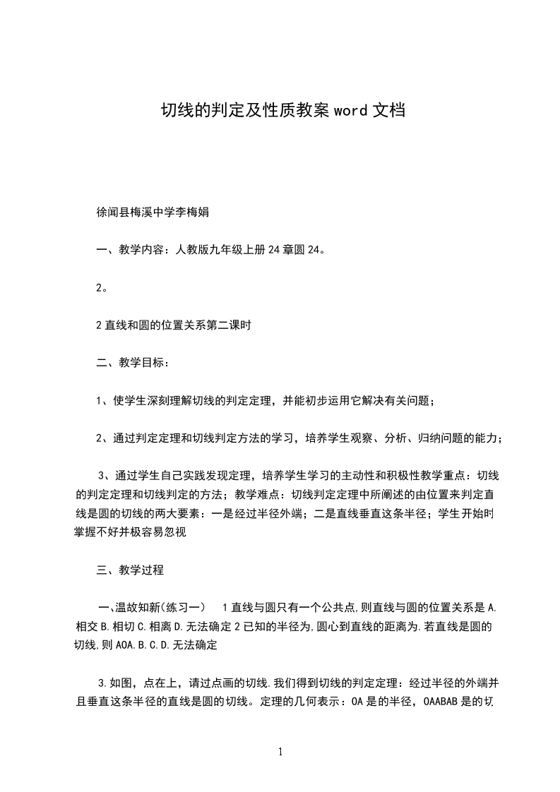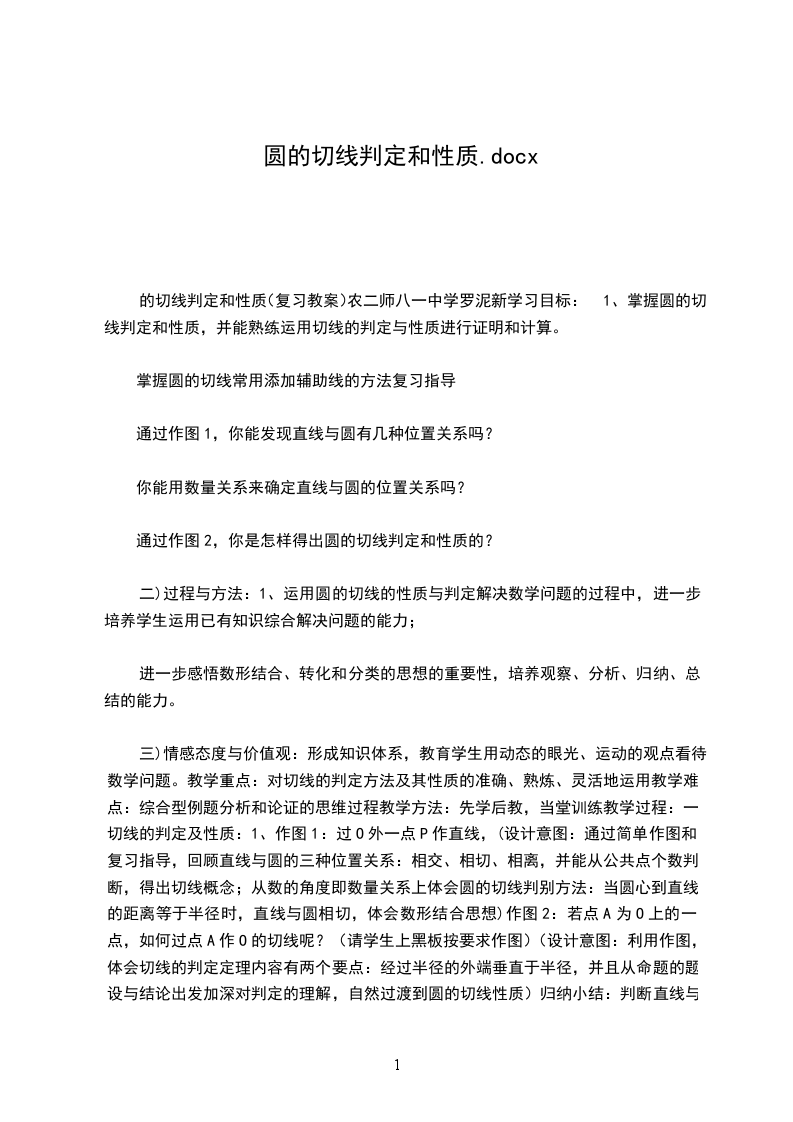 二)过程与方法:1、运用圆的切线的性质与判定解决数学问题的过程中,进一步培养学生运用已有知识综合解决问题的能力;