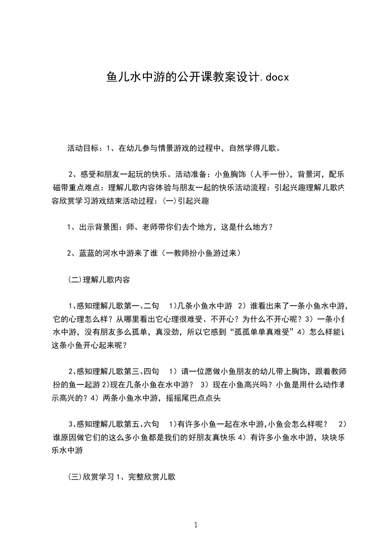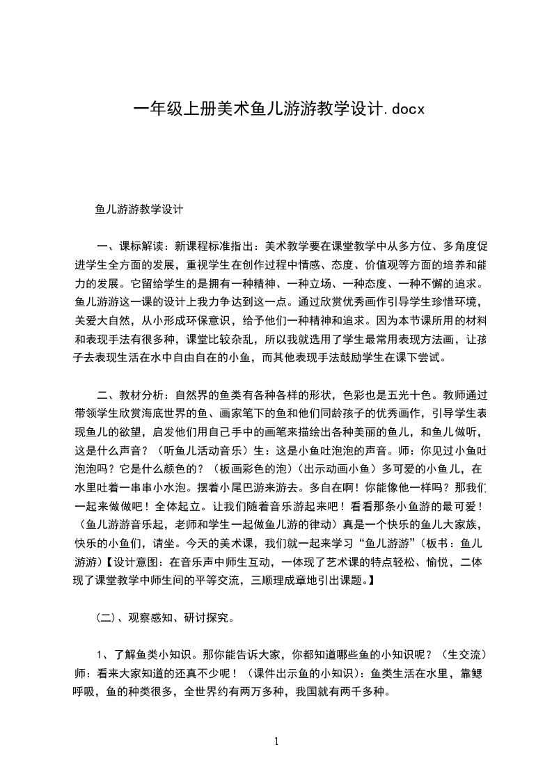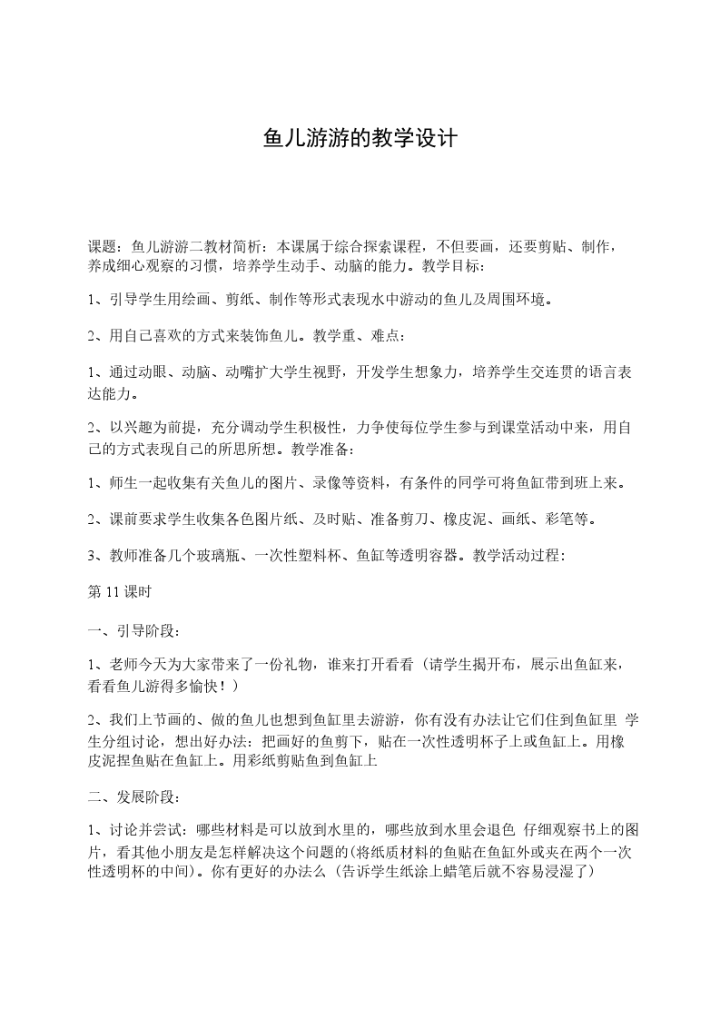 课题:鱼儿游游二教材简析:本课属于综合探索课程,不但要画,还要剪贴、制作,养成细心观察的习惯,培养学生动手、动脑的能力。教学目标: