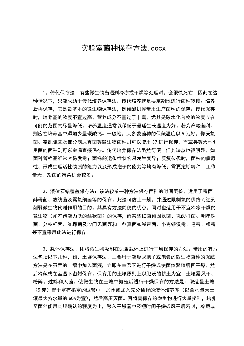 6、冷冻保存法:适用于抗冻力强的微生物。这些微生物可在其菌体细胞外遭受冻结的情况下而不受损伤,而对其它大多数微生物而言,无论在细胞外冻结还是在细胞内冻结,都会对菌体造成损伤,因此当采用这种保藏方法时,应注意以下几点,要选择适于冷冻干燥的菌龄细胞;要选择适宜的培养基,因为某些微生物对冷冻的抵抗力,常随培养基成分的变化而显示出巨大差异;要选择合适的菌液浓度,通常菌液浓度越高,生存率越高,保存期也越长;最好在菌液内不添加电解质(如食盐等);可在菌液内添加甘油等保护剂,以防止在冷冻过程中出现菌体大量死亡的现象。同样,也可添加各种糖类、去纤维血液和脱脂牛乳等具有良好保护效果的溶剂,但对有些微生物而言,不加保护剂时更有效。原则上应尽快进行冷冻处理,但当加入保护剂时,可静置一段时间后再进行处理。就动物细胞而言,应在20范围内以1/min左右的速度缓慢降温,此后必须尽快降到贮藏温度;而对绝大多数微生物而言,则不必如此,如结构较为复杂的原虫则可在35范围内进行缓慢降温,而噬菌体则必需采用上述的二阶段法进行冷冻;若进行长期保存,则贮藏温度越低越好;取用冷冻保存的菌种时,应采取速融措施,即在3540温水中轻轻振荡使之迅速融解。而就厌氧菌来说,则应选择静置融化的措施。当冷冻菌融化后,应尽量避免再次冷冻,否则菌体的存活率将显著下降。常用的冷冻保存法包括:低温冰箱保存法(