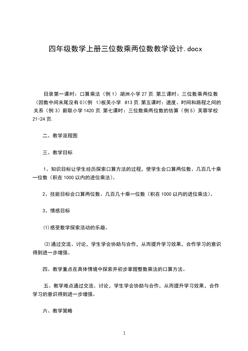 目录第一课时:口算乘法(例1)湖洲小学27页.第三课时:三位数乘两位数(因数中间末尾没有0)(例1)板芙小学813页.第五课时:速度、时间和路程之间的关系(例3)新联小学1420页.第七课时:三位数乘两位数的估算(例5)芙蓉学校21-24页.
