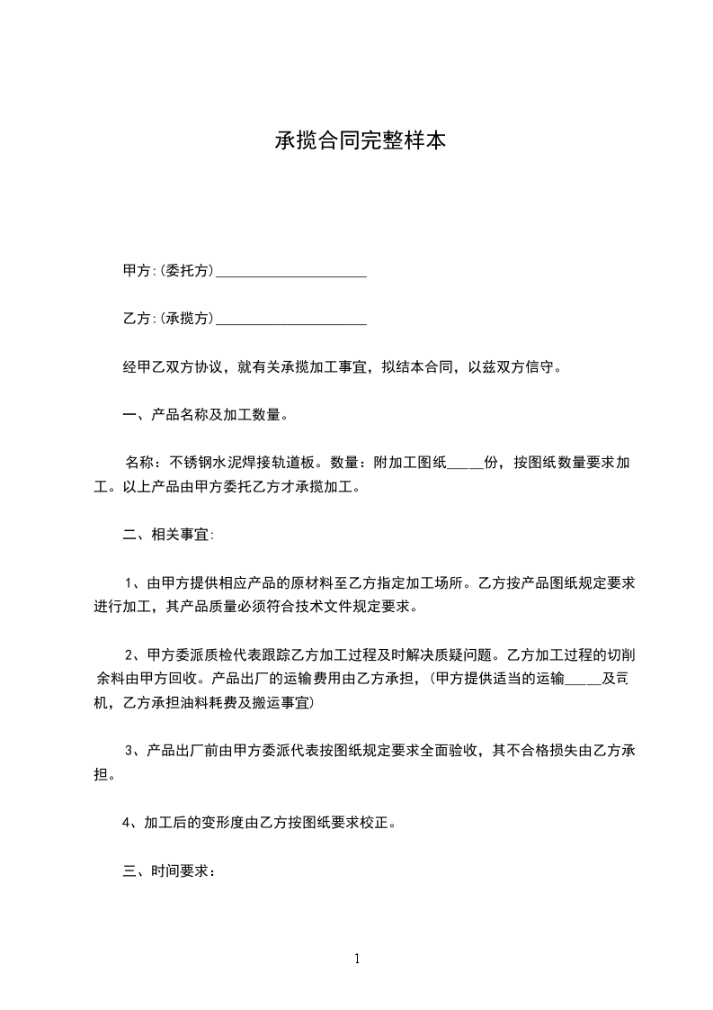 名称:不锈钢水泥焊接轨道板。数量:附加工图纸_____份,按图纸数量要求加工。以上产品由甲方委托乙方才承揽加工。