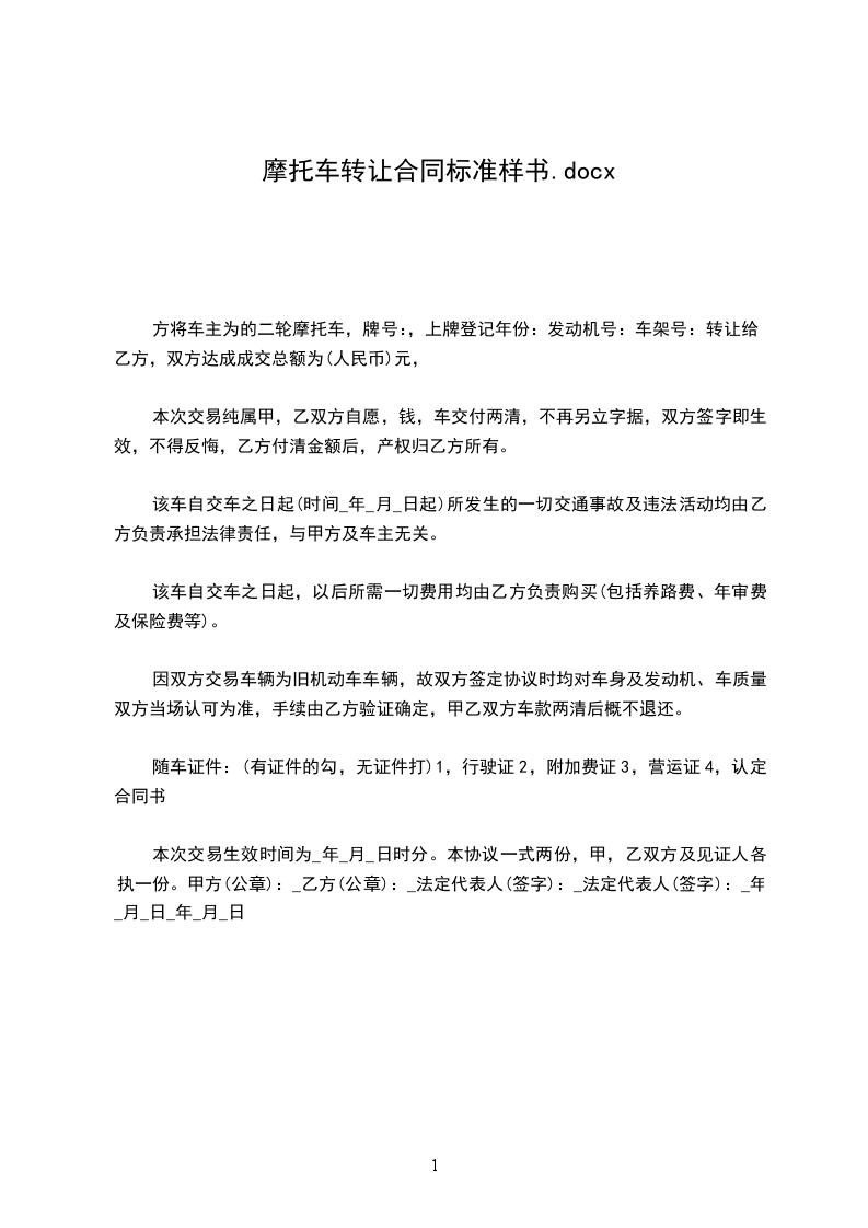 方将车主为的二轮摩托车,牌号:,上牌登记年份:发动机号:车架号:转让给乙方,双方达成成交总额为(人民币)元,