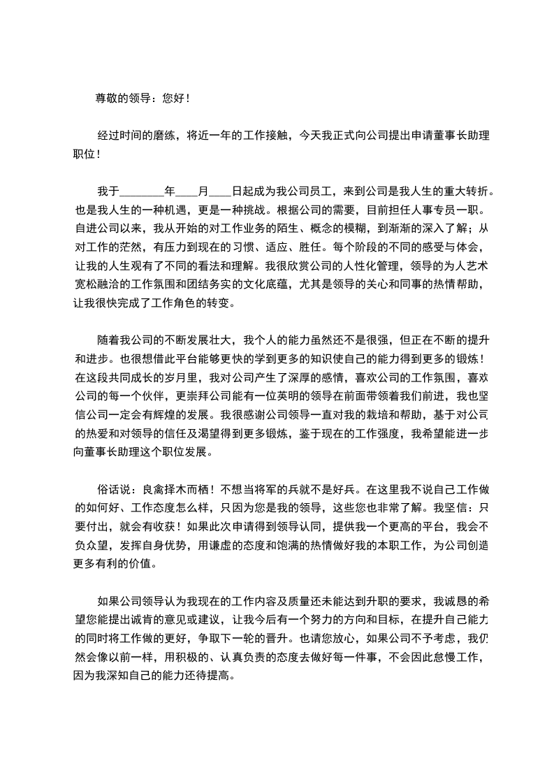 随着我公司的不断发展壮大,我个人的能力虽然还不是很强,但正在不断的提升和进步。也很想借此平台能够更快的学到更多的知识使自己的能力得到更多的锻炼!在这段共同成长的岁月里,我对公司产生了深厚的感情,喜欢公司的工作氛围,喜欢公司的每一个伙伴,更崇拜公司能有一位英明的领导在前面带领着我们前进,我也坚信公司一定会有辉煌的发展。我很感谢公司领导一直对我的栽培和帮助,基于对公司的热爱和对领导的信任及渴望得到更多锻炼,鉴于现在的工作强度,我希望能进一步向董事长助理这个职位发展。