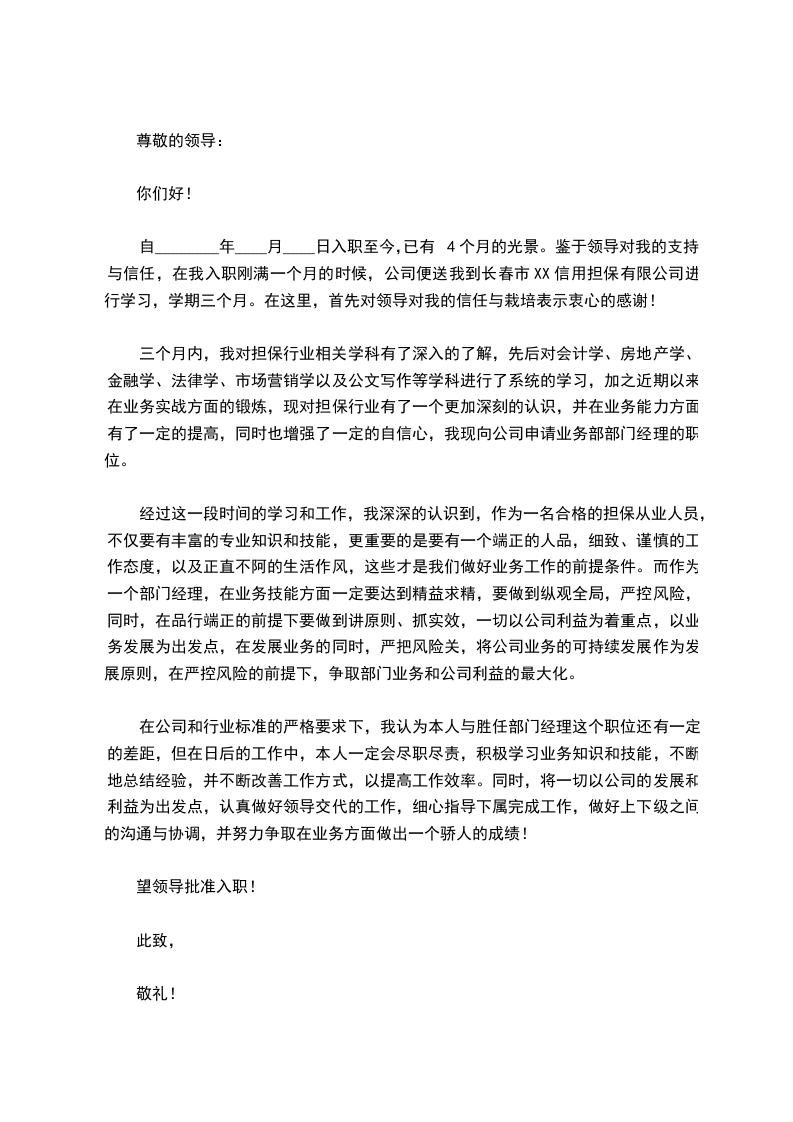 自________年____月____日入职至今,已有4个月的光景。鉴于领导对我的支持与信任,在我入职刚满一个月的时候,公司便送我到长春市XX信用担保有限公司进行学习,学期三个月。在这里,首先对领导对我的信任与栽培表示衷心的感谢!