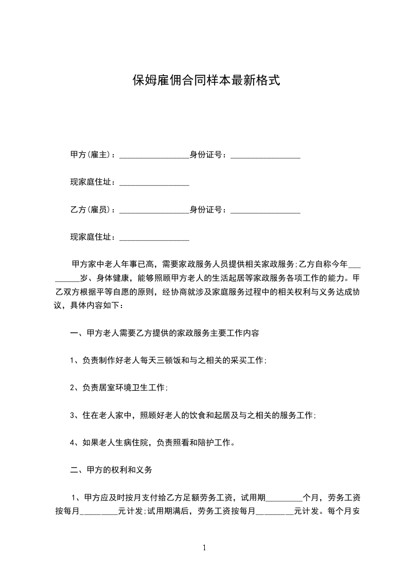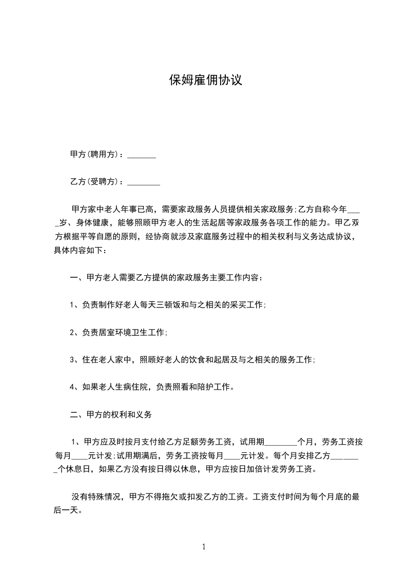 甲方家中老人年事已高,需要家政服务人员提供相关家政服务;乙方自称今年_________岁、身体健康,能够照顾甲方老人的生活起居等家政服务各项工作的能力。甲乙双方根据平等自愿的原则,经协商就涉及家庭服务过程中的相关权利与义务达成协议,具体内容如下: