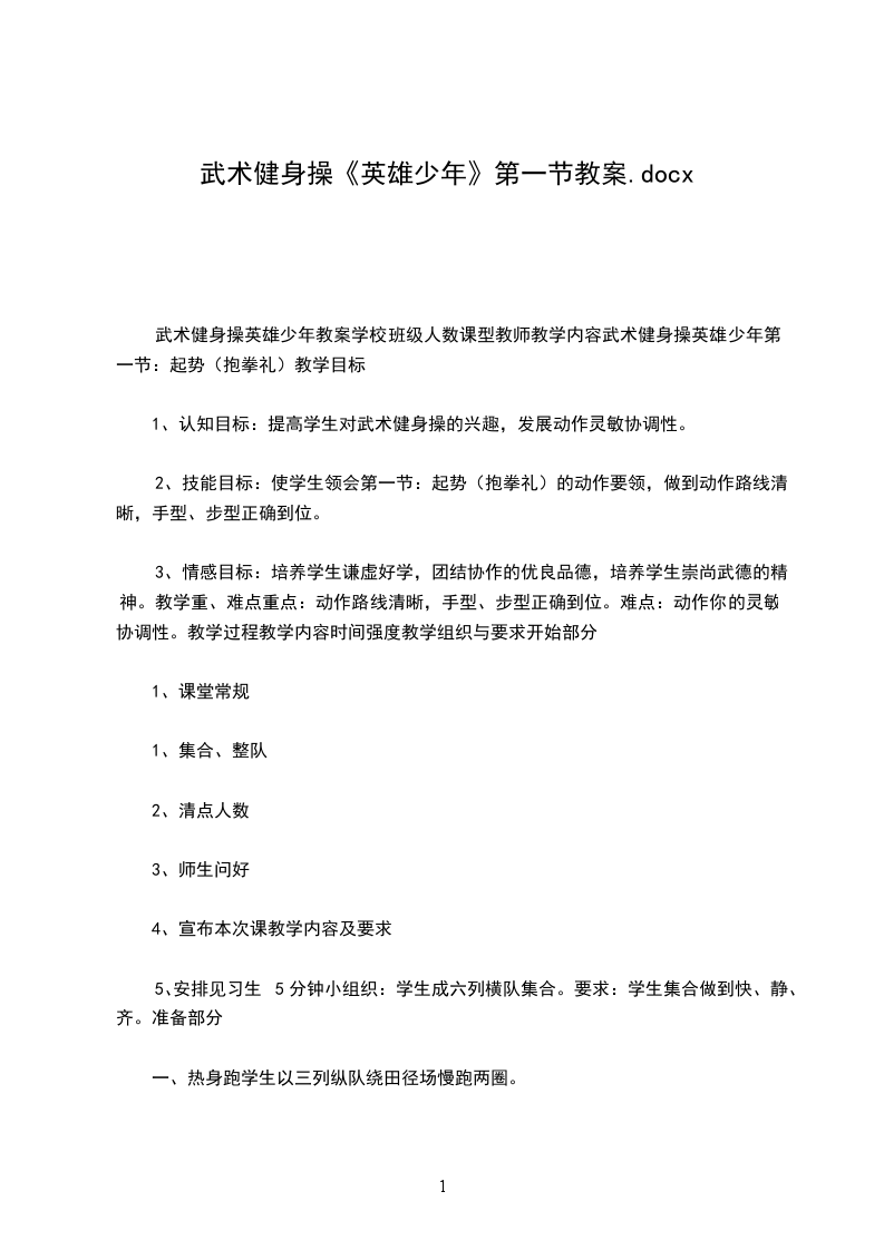 武术健身操英雄少年教案学校班级人数课型教师教学内容武术健身操英雄少年第一节:起势(抱拳礼)教学目标
