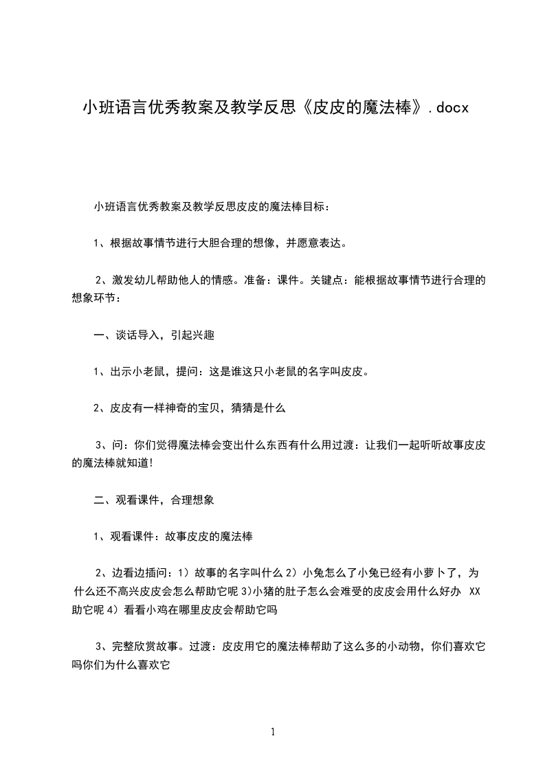 3、完整欣赏故事。过渡:皮皮用它的魔法棒帮助了这么多的小动物,你们喜欢它吗你们为什么喜欢它