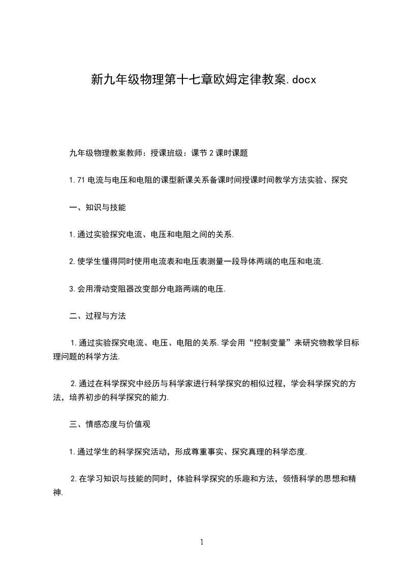 五、布置作业:练习册板书设计:第1节电流与电压和电阻的关系在电阻一定的情况下,导体中的电流跟这段导体两端的电压成正比在电压不变的情况下,导体中的电流跟导体的电阻成反比.教学反思:.九年级物理教案教师:授课班级:课节1课时课题