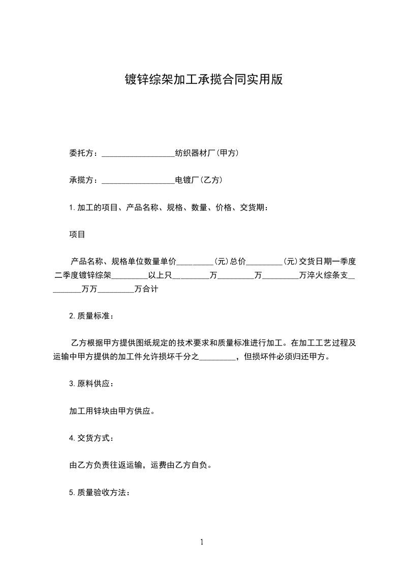 甲方委托乙方加工镀锌、淬火等,乙方应按规定日期完成;逾期由乙方负担甲方的经济损失,每天按加工产品总值千分之_________交纳罚金。甲方未按规定的时间和数量交付乙方加工物品,因而造成乙方停工损失,应按实际损失赔偿。