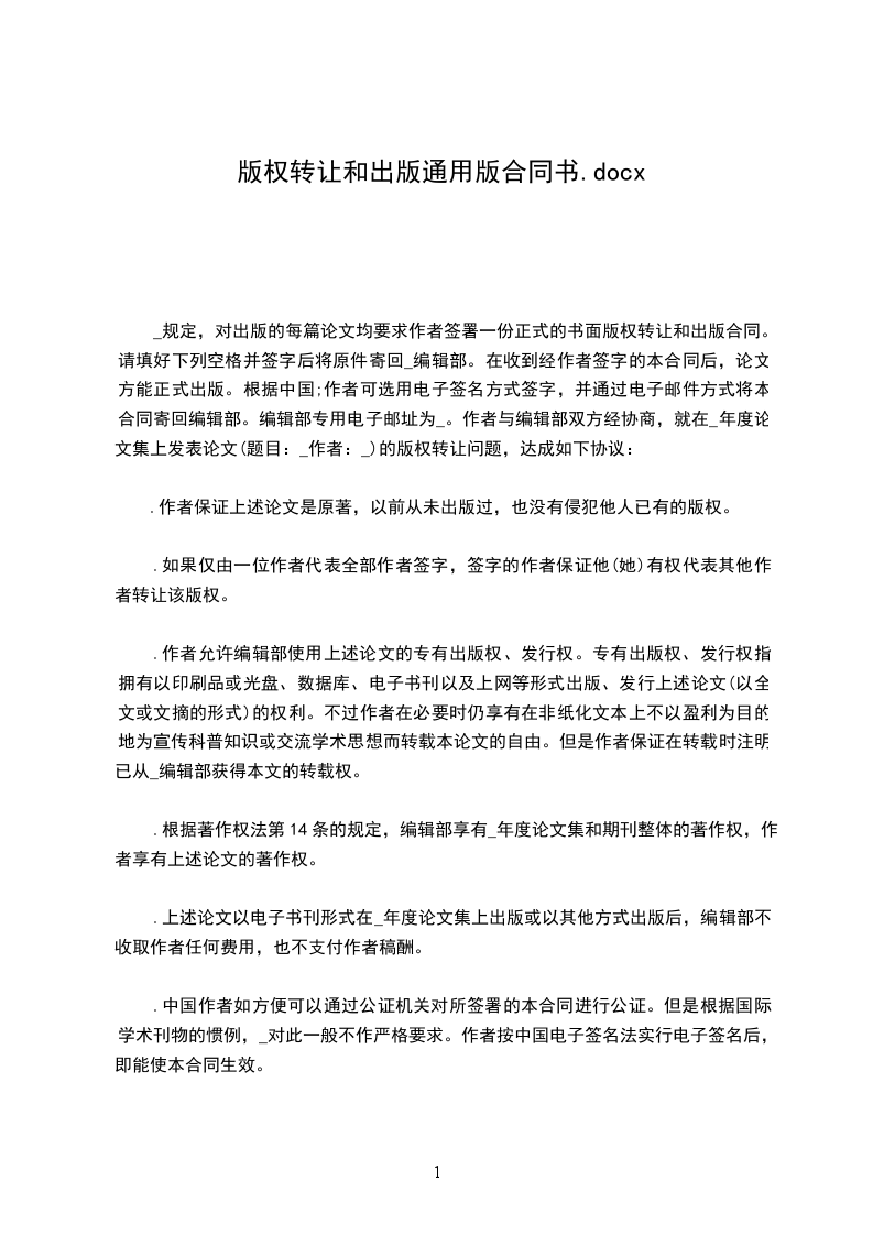 _规定,对出版的每篇论文均要求作者签署一份正式的书面版权转让和出版合同。请填好下列空格并签字后将原件寄回_编辑部。在收到经作者签字的本合同后,论文方能正式出版。根据中国;作者可选用电子签名方式签字,并通过电子邮件方式将本合同寄回编辑部。编辑部专用电子邮址为_.作者与编辑部双方经协商,就在_年度论文集上发表论文(题目:_作者:_)的版权转让问题,达成如下协议: