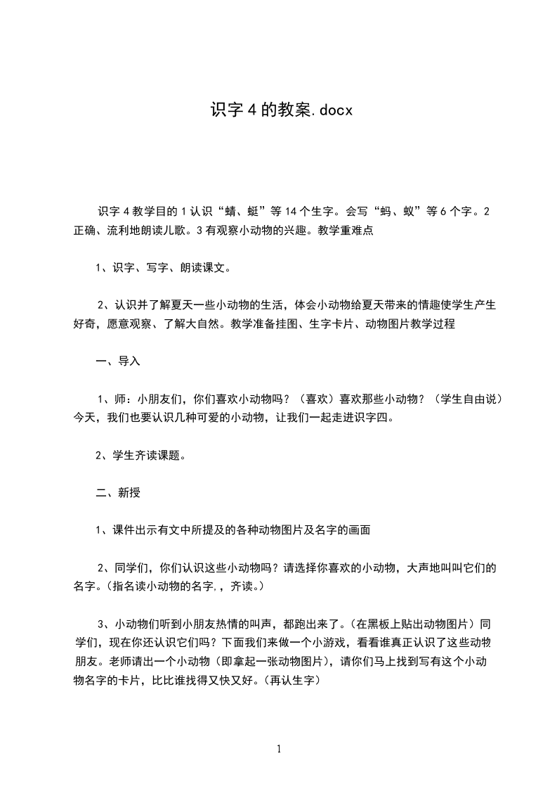 识字4教学目的1认识“蜻、蜓”等14个生字。会写“蚂、蚁”等6个字。2正确、流利地朗读儿歌。3有观察小动物的兴趣。教学重难点