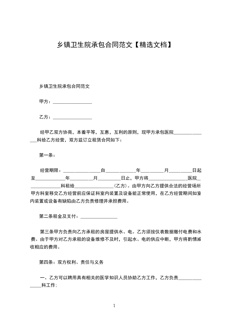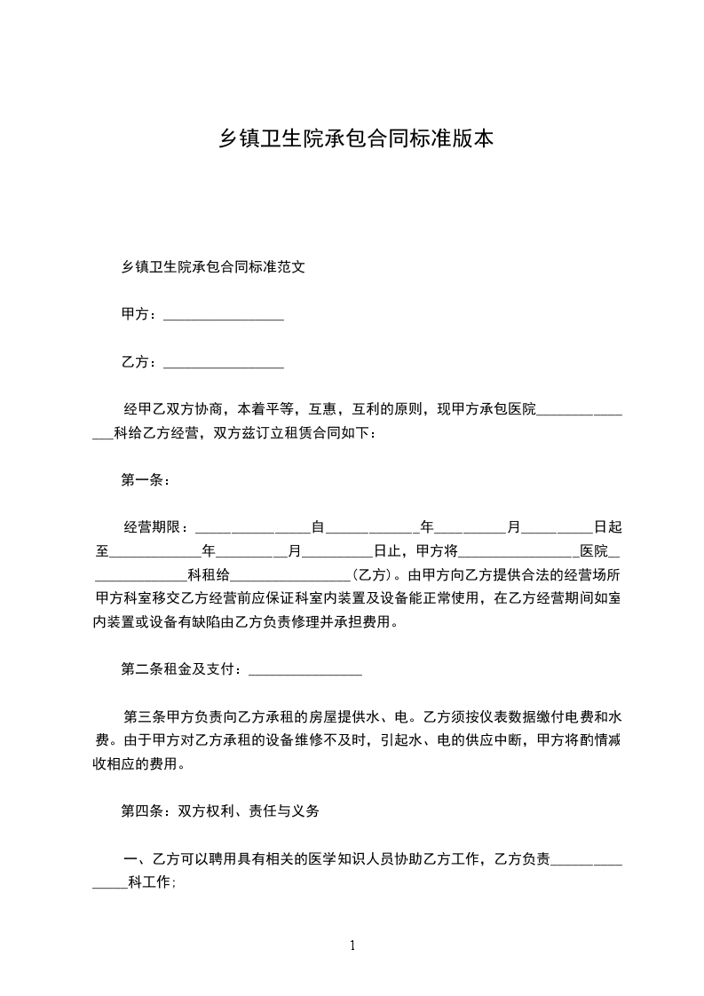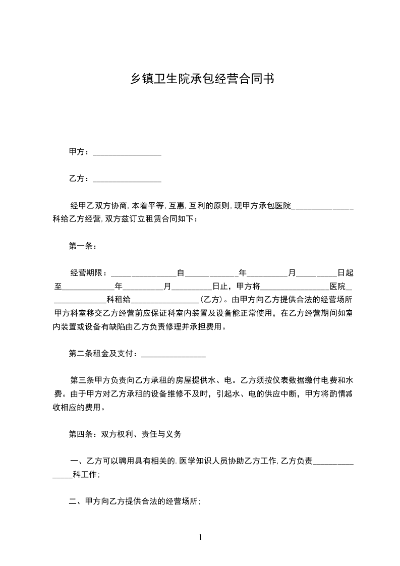 经甲乙双方协商,本着平等,互惠,互利的原则,现甲方承包医院_______________科给乙方经营,双方兹订立租赁合同如下: