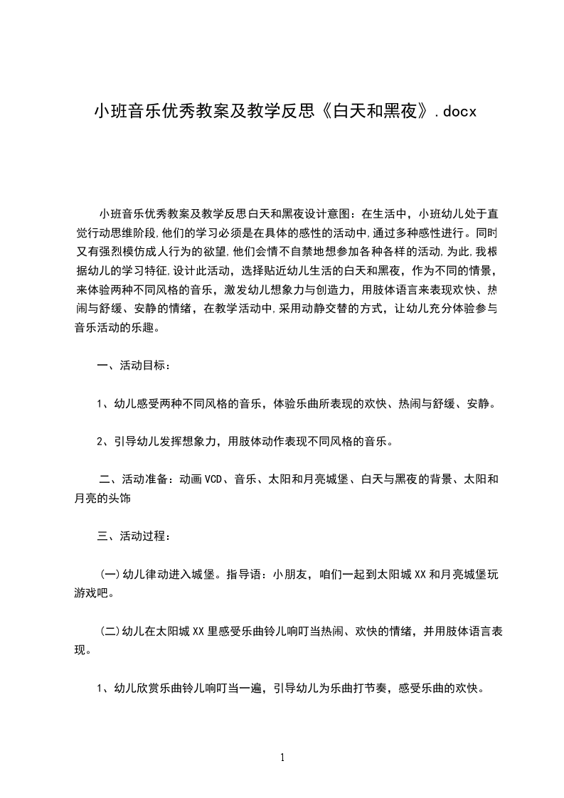 小班音乐优秀教案及教学反思白天和黑夜设计意图:在生活中,小班幼儿处于直觉行动思维阶段,他们的学习必须是在具体的感性的活动中,通过多种感性进行。同时又有强烈模仿成人行为的欲望,他们会情不自禁地想参加各种各样的活动,为此,我根据幼儿的学习特征,设计此活动,选择贴近幼儿生活的白天和黑夜,作为不同的情景,来体验两种不同风格的音乐,激发幼儿想象力与创造力,用肢体语言来表现欢快、热闹与舒缓、安静的情绪,在教学活动中,采用动静交替的方式,让幼儿充分体验参与音乐活动的乐趣。
