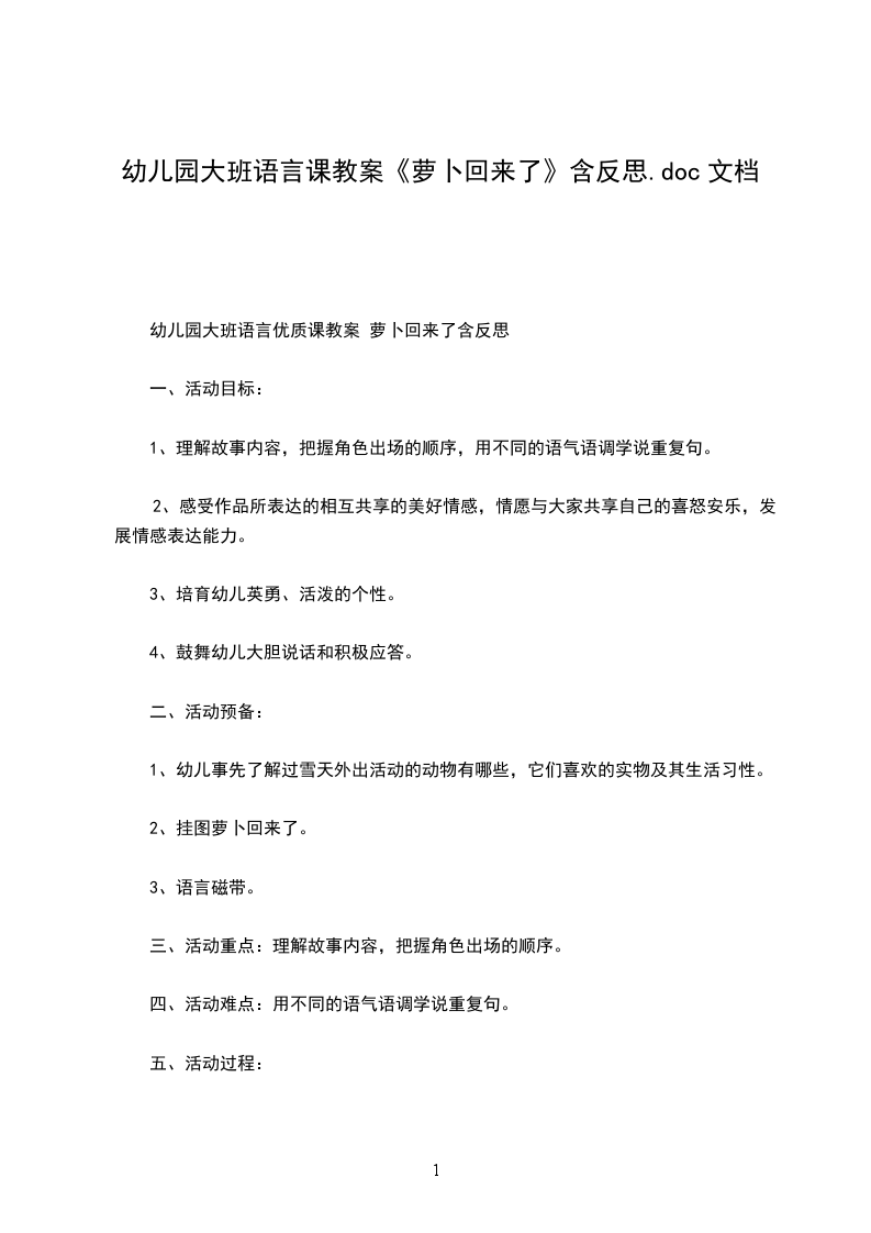 一、活动背景:小班幼儿由于年龄小,自我中心意识比较强,不大乐意将自己的东西与别人分享。而萝卜回来了则是一个非常经典的故事,具有很强的教育意义。通过故事中小动物之间的真挚感情来感化幼儿,能在很大程度上激发幼儿乐意分享,关心、爱护同伴的情感,增进友情,对于幼儿的影响是非常深刻、长远和富有意义的。因此,活动的选材既立足了当前目标,又延伸了长远的目标,具有很强的现实意义。由于我实施的对象小班上学期的幼儿,他们的语言表达能力相对还是很薄弱的,针对这个特点,我将教材进行了改编,把比较复杂的故事情节改成了相对简单,幼儿又容易理解和接受的故事内容,利用三个小动物送萝卜的形式贯穿整个活动。