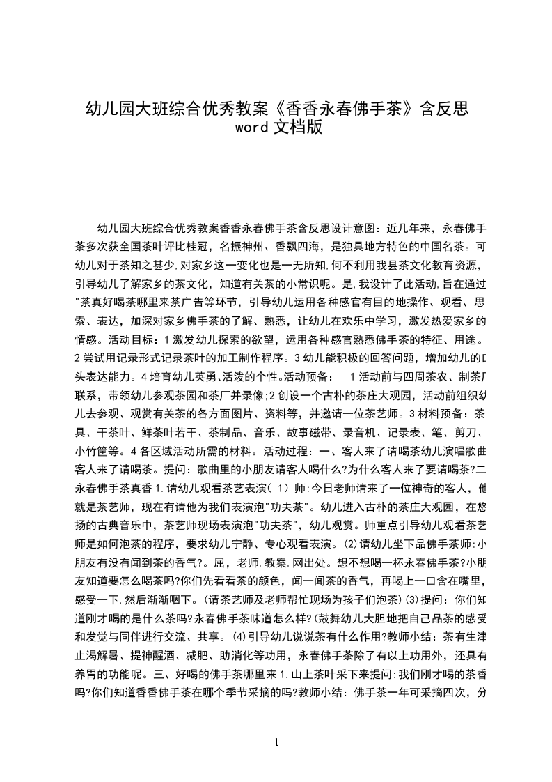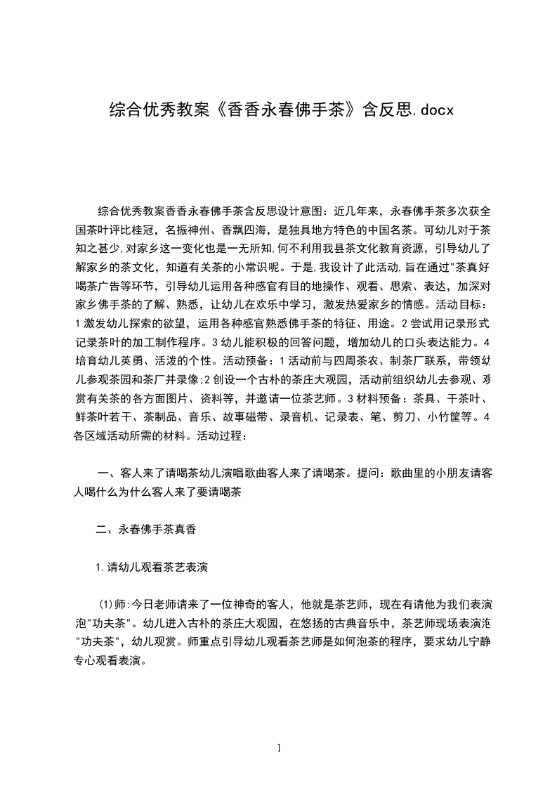 综合优秀教案香香永春佛手茶含反思设计意图:近几年来,永春佛手茶多次获全国茶叶评比桂冠,名振神州、香飘四海,是独具地方特色的中国名茶。可幼儿对于茶知之甚少,对家乡这一变化也是一无所知,何不利用我县茶文化教育资源,引导幼儿了解家乡的茶文化,知道有关茶的小常识呢。于是,我设计了此活动,旨在通过"茶真好喝茶广告等环节,引导幼儿运用各种感官有目的地操作、观看、思索、表达,加深对家乡佛手茶的了解、熟悉,让幼儿在欢乐中学习,激发热爱家乡的情感。活动目标:1激发幼儿探索的欲望,运用各种感官熟悉佛手茶的特征、用途。2尝试用记录形式记录茶叶的加工制作程序。3幼儿能积极的回答问题,增加幼儿的口头表达能力。4培育幼儿英勇、活泼的个性。活动预备:1活动前与四周茶农、制茶厂联系,带领幼儿参观茶园和茶厂并录像;2创设一个古朴的茶庄大观园,活动前组织幼儿去参观、观赏有关茶的各方面图片、资料等,并邀请一位茶艺师。3材料预备:茶具、干茶叶、鲜茶叶若干、茶制品、音乐、故事磁带、录音机、记录表、笔、剪刀、小竹筐等。4各区域活动所需的材料。活动过程: