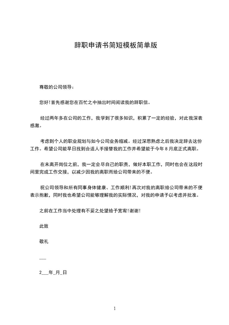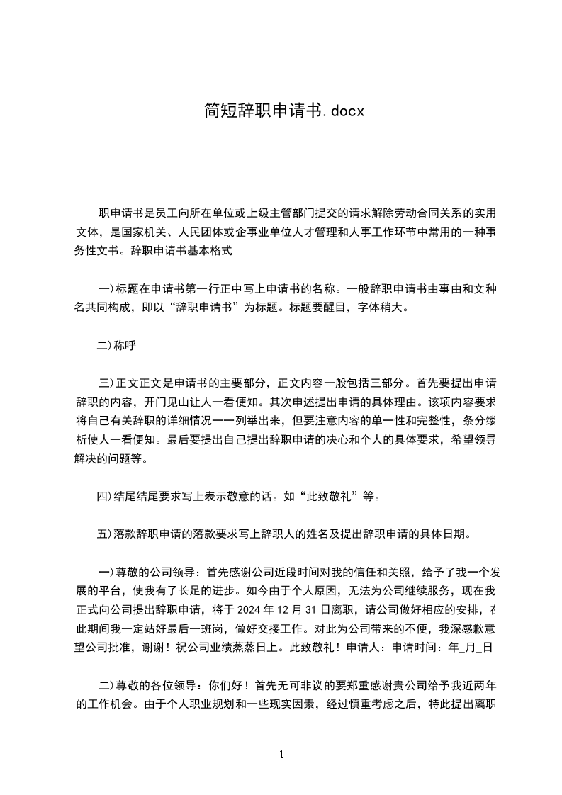 一)尊敬的公司领导:首先感谢公司近段时间对我的信任和关照,给予了我一个发展的平台,使我有了长足的进步。如今由于个人原因,无法为公司继续服务,现在我正式向公司提出辞职申请,将于2024年12月31日离职,请公司做好相应的安排,在此期间我一定站好最后一班岗,做好交接工作。对此为公司带来的不便,我深感歉意。望公司批准,谢谢!祝公司业绩蒸蒸日上。此致敬礼!申请人:申请时间:年_月_日