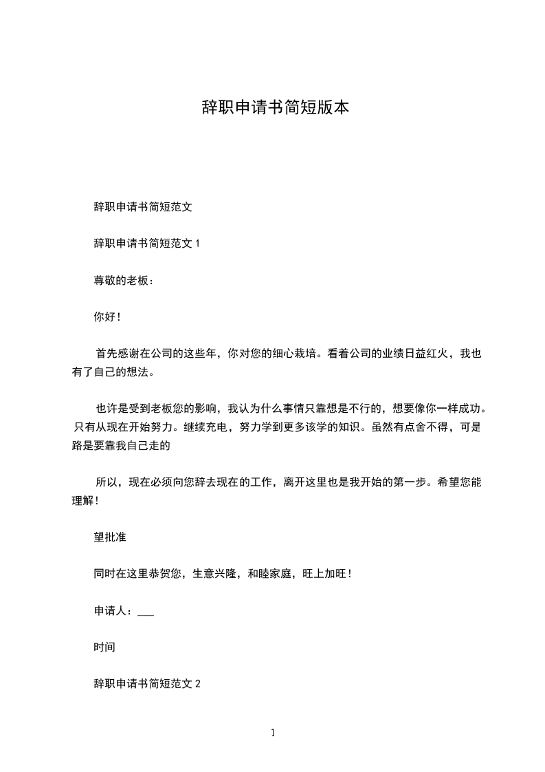 二)尊敬的各位领导:你们好!首先无可非议的要郑重感谢贵公司给予我近两年的工作机会。由于个人职业规划和一些现实因素,经过慎重考虑之后,特此提出离职申请,敬请批准。来到本公司也快两年了,正是这里我开始踏上了社会,完成了自己从一个学生到社会人的转变,有过欢笑收获,也有过辛酸和痛苦,公司平等的人际关系和开明的工作作风,让我感觉找到了一种依靠的感觉,工作了一年多,给我自己的感觉就是没有什么起色,由此我对于我最近在工作上的一些态度心理进行回想,最后我连自己想干什么,爱好做什么也不是很清楚,一连串的问号让我沮丧,也让我萌发了辞职的念头,并且让我确实了这个念头,或许有从新再跑到社会遭遇挫折,在不断打拼中去找属于自己职业定位才是我人生的下一步选择。在这一年多的时间里,我有幸得到了各位领导及同事们的倾心指导及热情的帮助,尤其感谢工段长对我的信任,支持和帮助,感谢所有给予帮助过我的同事们,忠心的祝愿贵公司蒸蒸日上,各位领导同事,工作愉快,身体健康。此致敬礼!申请人:申请时间:年_月_日