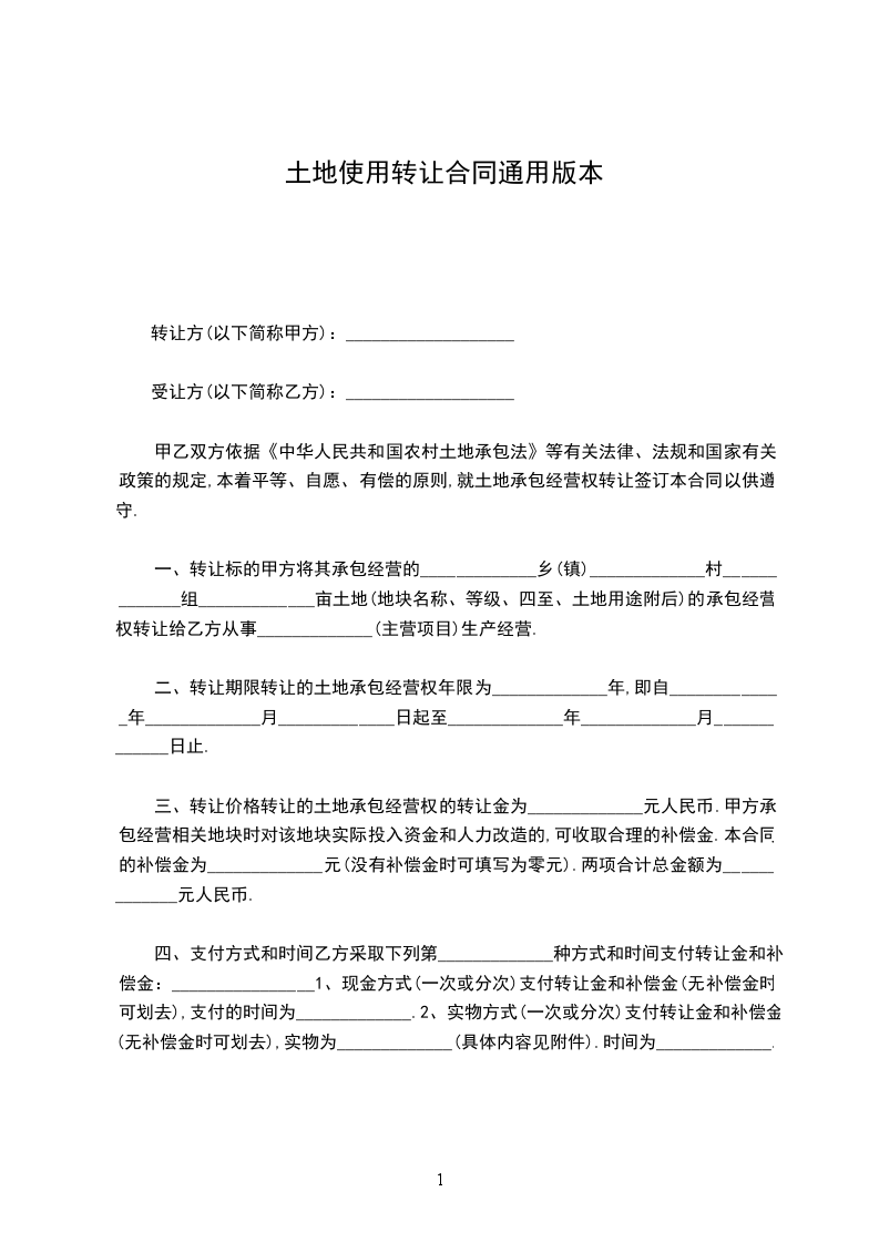 三、转让价格转让的土地承包经营权的转让金为_____________元人民币.甲方承包经营相关地块时对该地块实际投入资金和人力改造的,可收取合理的补偿金.本合同的补偿金为_____________元(没有补偿金时可填写为零元).两项合计总金额为_____________元人民币.