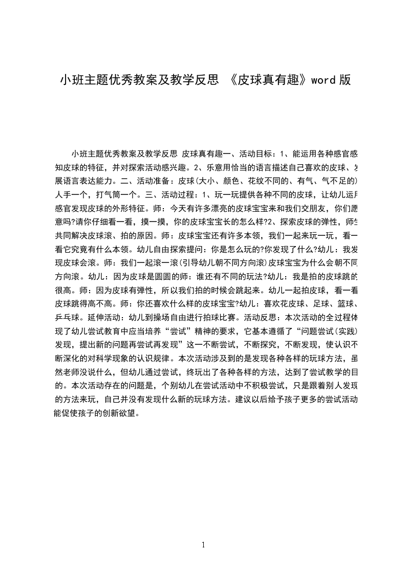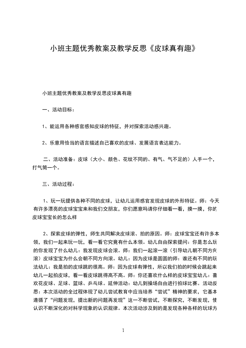 2、探索皮球的弹性,师生共同解决皮球滚、拍的原因。师:皮球宝宝还有许多本领,我们一起来玩一玩,看一看它究竟有什么本领。幼儿自由探索提问:你是怎么玩的你发现了什么幼儿:我发现皮球会滚。师:我们一起滚一滚(引导幼儿朝不同方向滚)皮球宝宝为什么会朝不同方向滚。幼儿:因为皮球是圆圆的师:谁还有不同的玩法幼儿:我是拍的皮球跳的很高。师:因为皮球有弹性,所以我们拍的时候会跳起来。幼儿一起拍皮球,看一看皮球跳得高不高。师:你还喜欢什么样的皮球宝宝幼儿:喜欢花皮球、足球、篮球、乒乓球。延伸活动:幼儿到操场自由进行拍球比赛。活动反思:本次活动的全过程体现了幼儿尝试教育中应当培养“尝试”精神的要求,它基本遵循了“问题发现,提出新的问题再发现”这一不断尝试,不断探究,不断发现,使认识不断深化的对科学现象的认识规律。本次活动涉及到的是发现各种各样的玩球方法,虽然老师没说什么,但幼儿通过尝试,终于玩出了各种各样的方法,达到了尝试教学的目的。本次活动存在的问题是,个别幼儿在尝试活动中不积极尝试,只是跟着别人发现的方法来玩,自己并没有发现什么新的玩球方法。建议以后给予孩子更多的尝试活动,能促使孩子的创新欲望。