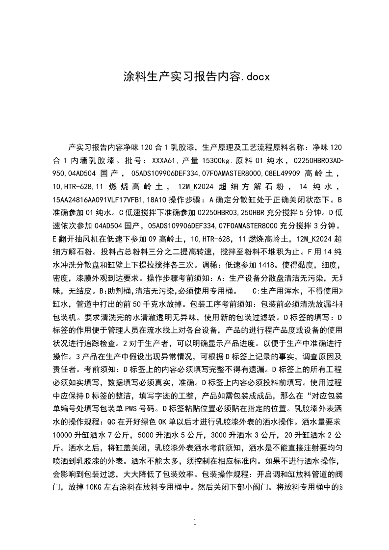 产实习报告内容净味120合1乳胶漆,生产原理及工艺流程原料名称:净味120合1内墙乳胶漆。批号:XXXA61,产量15300kg.原料01纯水,02250HBR03AD-950,04AD504国产,05ADS109906DEF334,07FOAMASTER8000,C8EL49909高岭土,10,HTR-628,11燃烧高岭土,12M_K2024超细方解石粉,14纯水,15AA24816AA091VLF17VFB1,18A1O操作步骤:A确定分散缸处于正确关闭状态下。B准确参加01纯水。C低速搅拌下准确参加02250HBR03,250HBR充分搅拌5分钟。D低速依次参加04AD504国产,05ADS109906DEF334,07FOAMASTER8000充分搅拌3分钟。E翻开抽风机在低速下参加09高岭土,10,HTR-628,11燃烧高岭土,12M_K2024超细方解石粉。投料占总粉料三分之二提高转速,搅拌至粉料不堆积为止。F用14纯水冲洗分散盘和缸壁上下提拉搅拌各三次。调稀:低速参加1418。使得黏度,细度,密度,漆膜外观到达要求。操作步骤考前须知:A:生产设备分散盘清洁无污染,无异味,无结皮。B:助剂桶,清洁无污染,必须使用专用桶。C:生产用浑水,不得使用冲缸水,管道中打出的前50千克水放掉。包装工序考前须知:包装前必须清洗放漏斗和包装机。要求清洗完的水清澈透明无异味,使用新的包装过滤袋。D标签的填写:D标签的作用便于管理人员在流水线上对各台设备,产品的进行程产品度或设备的使用状况进行追踪检查。2对于生产者,可以明确显示产品进度。以便于生产中准确进行操作。3产品在生产中假设出现异常情况,可根据D标签上记录的事实,调查原因及责任者。考前须知:D标签上的内容必须填写完整不得有遗漏。D标签上的所有工程必须如实填写,数据填写必须真实,准确。D标签上内容必须投料前填写。使用过程中应保持D标签的整洁,填写字迹的工整,产品如需包装成成品,那么在“对应包装单编号处填写包装单PWS号码。D标签粘贴位置必须贴在指定的位置。乳胶漆外表洒水的操作规程:QC在开好绿色OK单以后才进行乳胶漆外表的洒水操作。洒水量要求:10000升缸洒水7公斤,5000升洒水5公斤,3000升洒水3公斤,20升缸洒水2公斤。洒水之后,将缸盖关闭,乳胶漆外表洒水考前须知,洒水是不能直接注射要均匀喷洒到乳胶漆的外表。洒水不能太多,须控制在相应标准内。如果不进行洒水操作,会影响到包装过滤,大大降低了包装效率。包装操作规程:开启调和缸放料管道的阀门,放掉10KG左右涂料在放料专用桶中。然后关闭下部小阀门。将放料专用桶中的涂料提到楼上相应的调和缸中倒入。在放料上卡上过滤接盘,套上过滤袋,将包装斗移至调和管道下面,确认包装斗阀门关闭。确认电子称上的空桶归零后开始包装作业,对此桶包装产品进行确认:重量在规定范围内,产品流动时一致均匀,色泽与色卡的颜色一样。当以上的检验完以后,没有发现问题才能选用该设备,在该设备旁边写好产品的名称和产量以及操作者的姓名,产品的批号操作日期等。从原料检验合格经过预混,预混检验合格经过筛选。调希到过滤包装的一个工艺流程。设备结构、工作原理和物料流程水性车间的设备:水性车间有20缸,缸的容量也不同,有20升,3000升,5000升,8000升,10000升缸。有的缸是两个缸一个搅拌器,有的是三个缸一个搅拌器。根据产量的多少选择不同的缸,有的缸是调色专用缸。选好后要做的一件事是,检查TPM点检表:1电气操作盘完好无损,无污垢。2缸盖配件齐全。3叶面无变形损坏,齿面正常。4风管,风阀完好无损坏。能有很好的吸风。5缸底无其他物体。6连轴器,齐全。7减速器无异常声音,无油滴渗漏。8主轴无严重抖动异常声音9整机无异常声音和振动。同时每排缸的正上面都有电动葫芦,方便投大包的粉料,有几个投料车,乳液有的是用管道打,比方NP96就是用的是管道打,有的是用坦克装的,一个坦克装有1000KG于此,有专门的助剂区域,方便与生产的管理。物料的流程,物流方面根据方案部的下单,按每一张单子来备料,备好以后才运送到车间生产,同时还有另一个事情就是;成品运输到仓库,和发货。三废的处理情况和治理情况据我的理解立邦三废问题的处理是,废弃的溶剂,经过蒸馏脱水后回收利用,把它作为清洗的溶剂,一是可以降低本钱,二来减少对环境的污染。但因为目前的技术不到位。还不能回收作为原料来使用,同时回收的溶剂中还有大量的水分,还在改良怎样最大化的蒸馏出水分,让溶剂的浓度更高。然而废气的处理是经过溶剂吸收了有害的成分,才排放到空气中。立邦污水处理流程图生活污水一格栅一生活污水调节池一泵生活水池T生产废水调节池T泵T反响池T沉淀池T水解酸化池生产废水调节池一泵排泥生物选择池SBR中间水池回流排泥泵;;;污泥池J泵机械过滤池活性炭过滤池回用水池水回收利用板式压滤器T泥饼外运投加消毒剂工业的快速开展和人民生活水平的不断提高,涂料的应用越来越广泛。与此同时,涂料生产过程中产生的大量工业有机废水、废气、固体废物对环境的污染引起社会的广泛关注,涂料使用时对人体健康的影响也越来越受到重视。环保、清洁已成为涂料工业产品在市场竞争中的重要砝码,无毒、无害成为涂料国际贸易中绿色壁垒的重要内容。目前,我国涂料市场上国外品牌成了高端涂料产品的主角。实现涂料过程中“三废的零排放是曾光明等追求的目标。甲醛污染、耐候性差、刺激人体皮肤和眼睛、生产过程中产生大量工业有机废水等,一直是传统涂料生产过程中无法防止和难以解决的问题。这些新型材