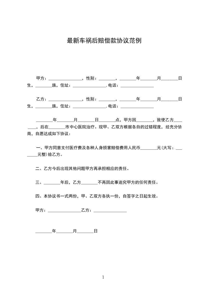 一、乙方自愿一次性赔偿甲方各种人身损害赔偿项目(包括丧葬费、死亡赔偿金、被抚养人生活费、精神损害抚慰金、处理事故家属误工费、交通费、住宿费等)共计_____万元(小写:_____________元)整。