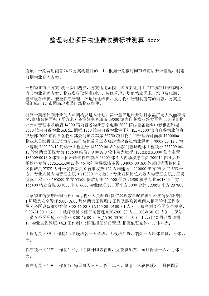 测算一期按计划开业的人员架构及进人计划。第一童当地已开项目水晶广场大致面积情况:商铺名称面积(平方米)备注好家乡超市23000馆内自备物业盛大百货200项目物业公司管理水晶酒店14000馆内自备物业苏宁电器3800馆内自备物业中影雅图影城3500馆内自备物业MUSE酒吧1350馆内自备物业宝乐迪KTV2600馆内自备物业健身俱乐部3000馆内自备物业其余商铺及车库38750项目物1司管理合计面积110000m:物业人员配置及工资情况:岗位名称数量工资班次情况备注物业经理170009:00-18:0物业客服3220:00-10轮休一工程主管145009:0018:0休郝门值班轮休工程领班335009:00-10轮休两天工程专员152500维修:9:0018:0轮休两天运行:122XXXX3000秩序主管136009:0018:0休挪门值班轮休秩序领班43202休4天内场秩序专员200012休4天外场秩序专员352XXXX0012休46天外两餐保洁主管134009:0018:0休郝门值班轮休公区保洁员XXX天外一餐收费员0暂未收费129人均建面:110000平方29人二853平方。专业人员人均管理面积(110000平方数):专业名称岗位人数人均管理面积月工资测算工程专业195800平方52500保洁专业462500平方76300秩序专业601840平方155400物业客服337000平方6600物业经理111万平方7000合计129853平方297800