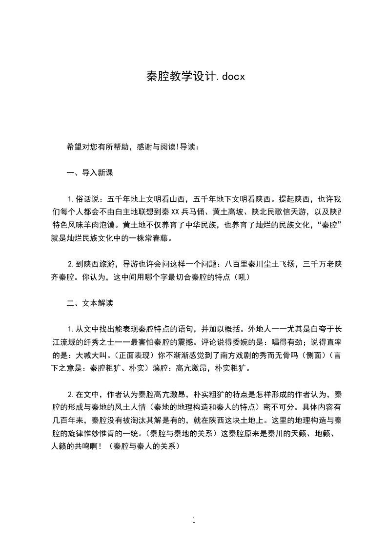 三、归纳总结从前面的分析中,我们对文章的内容已经有了大致的了解。请根据文章的内容和白己对文章的理解,为“秦腔”添加恰当的定语。“的秦腔”【示例】与秦人一样死不离窝的秦腔;与八百里秦J11地理构造惟妙惟肖的秦腔;与秦人一样朴实粗犷的秦腔;承载着秦人喜怒哀乐的秦腔;令三千万老陕无限痴迷的秦腔;象征着中华民族历史、文化和持久不衰生命力的秦腔;【板书设计】秦地一一空旷平坦,厚重实在与秦人一样死不离窝的秦腔;与八百里秦J11地理构造惟妙惟肖的秦腔;秦腔一一高亢激昂,朴实粗犷与秦人一样朴实粗犷的秦腔;承载着秦人喜怒哀乐的秦腔;令三千万老陕无限痴迷的秦腔;秦人一一二楞粗犷,朴实豪放感谢您的阅读,本文如对您有帮助,可编辑,谢谢