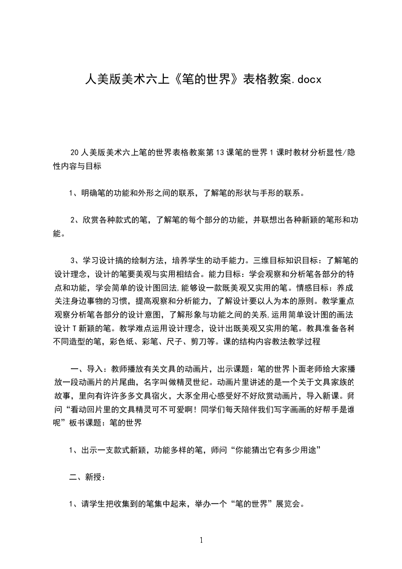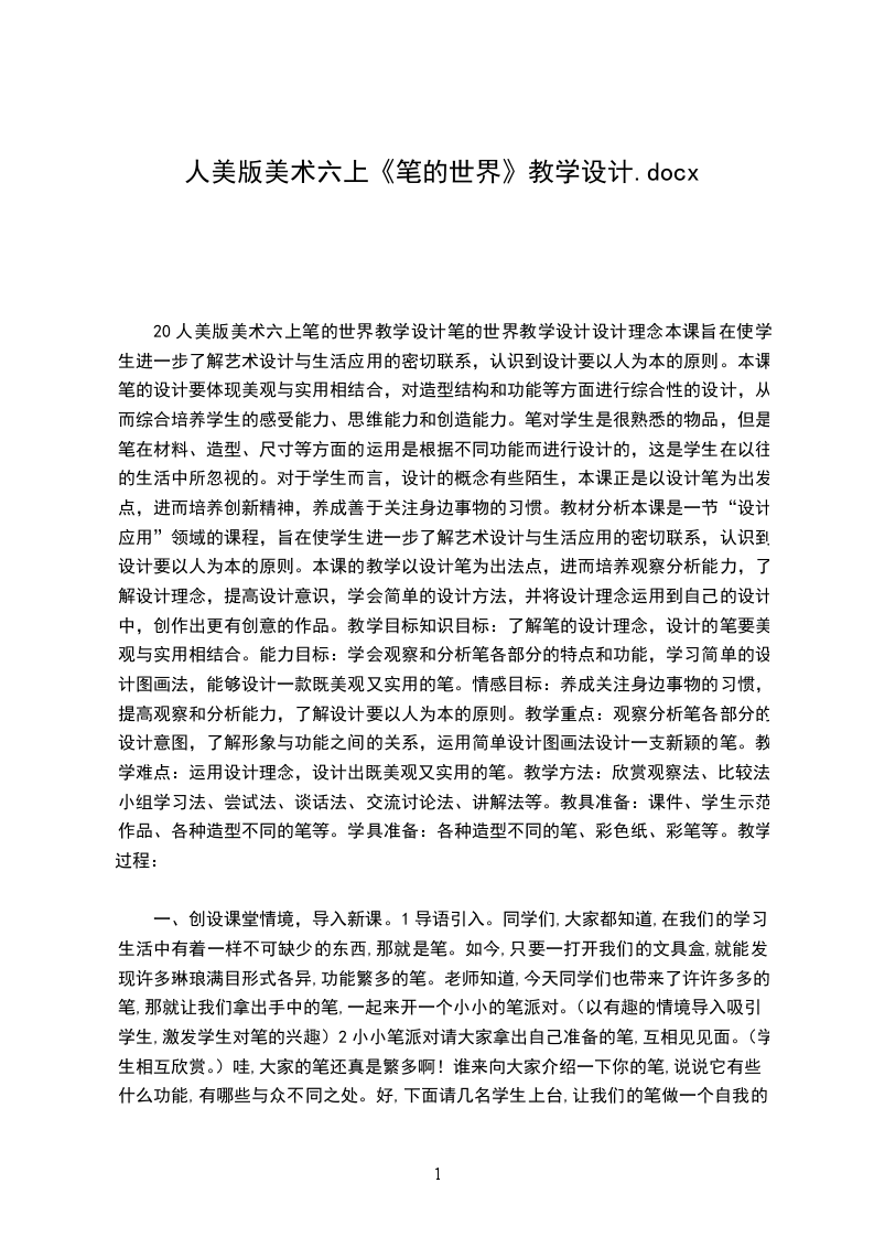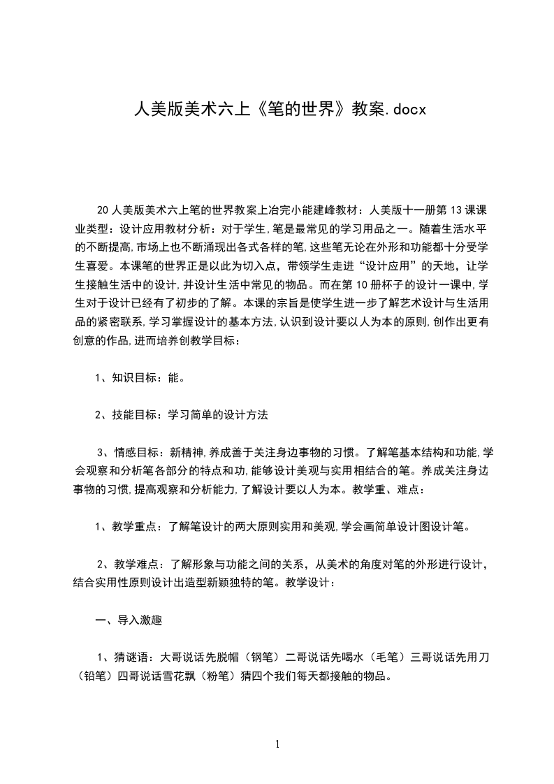 20人美版美术六上笔的世界教案上冶完小能建峰教材:人美版十一册第13课课业类型:设计应用教材分析:对于学生,笔是最常见的学习用品之一。随着生活水平的不断提高,市场上也不断涌现出各式各样的笔,这些笔无论在外形和功能都十分受学生喜爱。本课笔的世界正是以此为切入点,带领学生走进“设计应用”的天地,让学生接触生活中的设计,并设计生活中常见的物品。而在第10册杯子的设计一课中,学生对于设计已经有了初步的了解。本课的宗旨是使学生进一步了解艺术设计与生活用品的紧密联系,学习掌握设计的基本方法,认识到设计要以人为本的原则,创作出更有创意的作品,进而培养创教学目标: