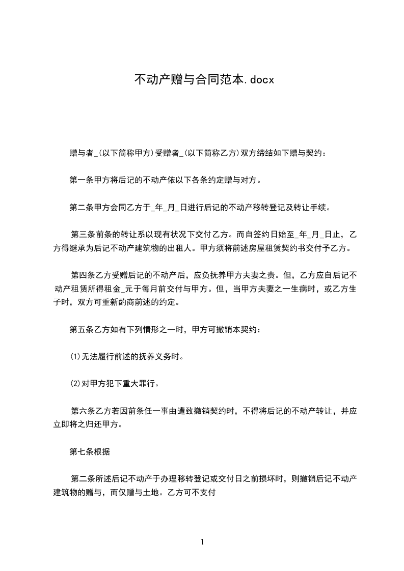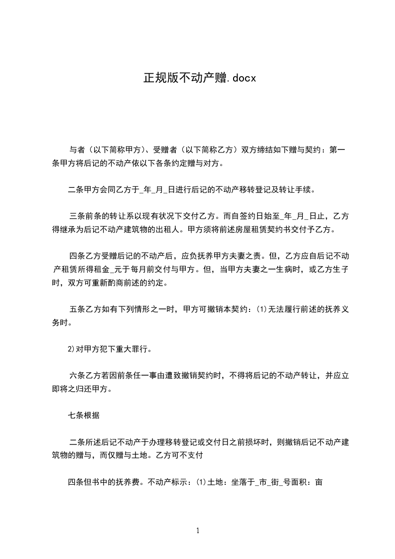 与者(以下简称甲方)、受赠者(以下简称乙方)双方缔结如下赠与契约:第一条甲方将后记的不动产依以下各条约定赠与对方。