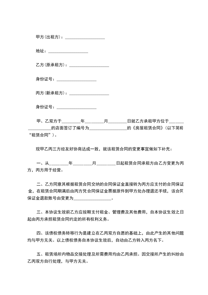 号:租赁合同履行主体变更协议甲方:乙方:丙方:签订日期:年月日出租人(以下简称“甲方”):原承租人(以下简称“乙方”):现承租人(以下简称“丙方”):保证人(以下简称“丁方”):甲、乙、丙、丁各方在平等、自愿、协商一致的基础上,就甲、乙、丙三方变更租赁合同履行主体,丁方提供保证等相关事宜订立如下条款,以资共同遵守: