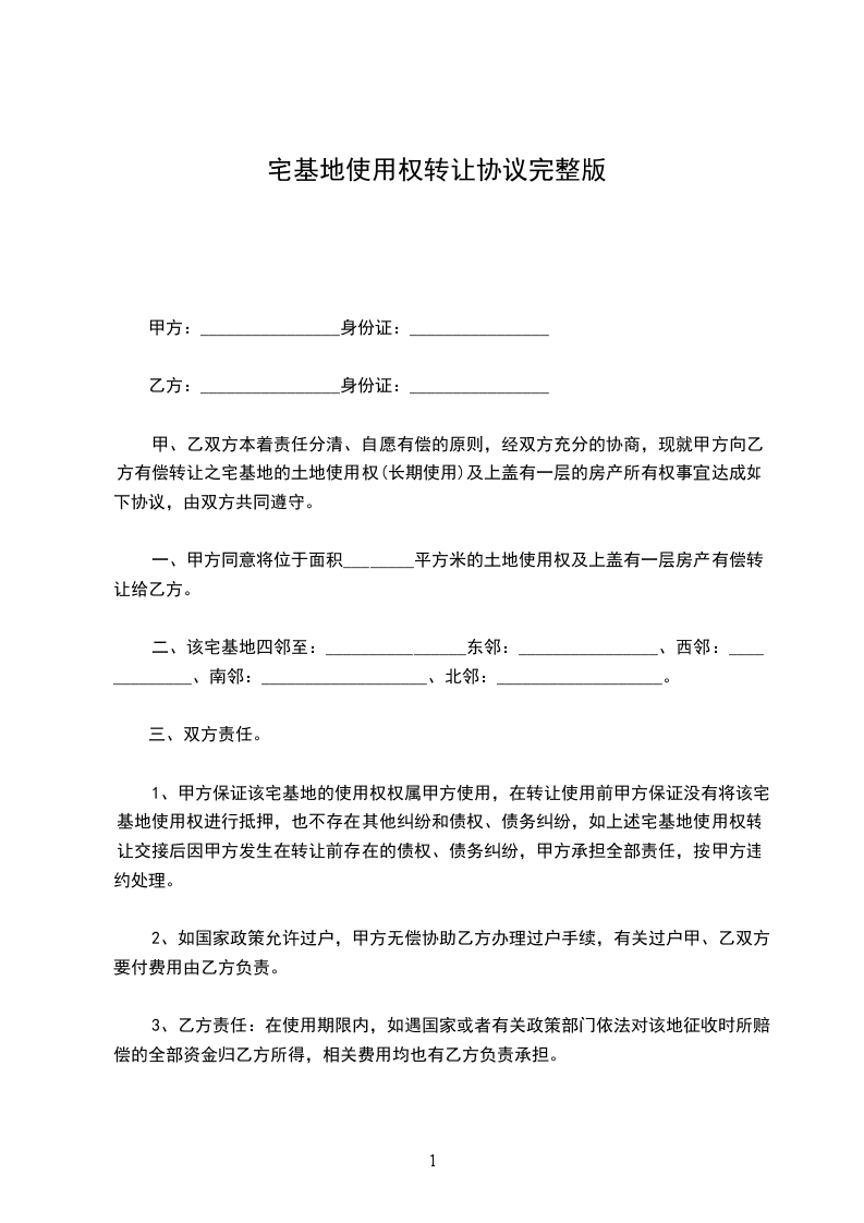 甲、乙双方本着责任分清、自愿有偿的原则,经双方充分的协商,现就甲方向乙方有偿转让之宅基地的土地使用权(长期使用)及上盖有一层的房产所有权事宜达成如下协议,由双方共同遵守。