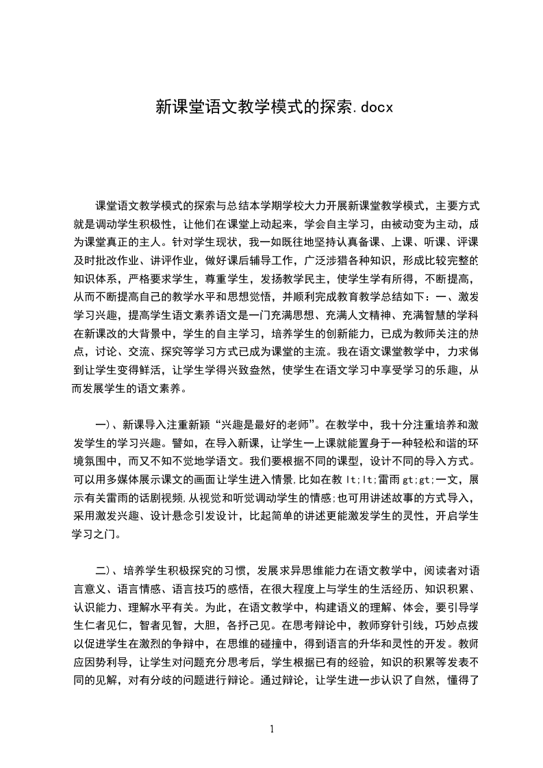 课堂语文教学模式的探索与总结本学期学校大力开展新课堂教学模式,主要方式就是调动学生积极性,让他们在课堂上动起来,学会自主学习,由被动变为主动,成为课堂真正的主人。针对学生现状,我一如既往地坚持认真备课、上课、听课、评课,及时批改作业、讲评作业,做好课后辅导工作,广泛涉猎各种知识,形成比较完整的知识体系,严格要求学生,尊重学生,发扬教学民主,使学生学有所得,不断提高,从而不断提高自己的教学水平和思想觉悟,并顺利完成教育教学总结如下:一、激发学习兴趣,提高学生语文素养语文是一门充满思想、充满人文精神、充满智慧的学科。在新课改的大背景中,学生的自主学习,培养学生的创新能力,已成为教师关注的热点,讨论、交流、探究等学习方式已成为课堂的主流。我在语文课堂教学中,力求做到让学生变得鲜活,让学生学得兴致盎然,使学生在语文学习中享受学习的乐趣,从而发展学生的语文素养。