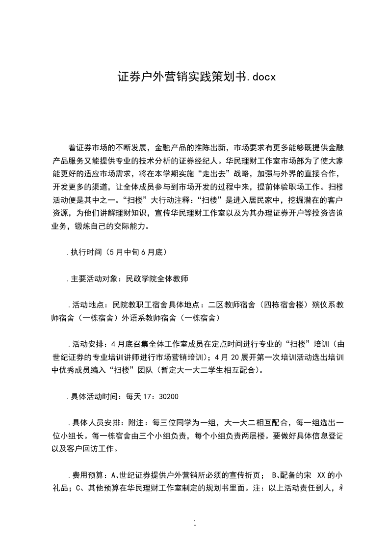 .费用预算:A、世纪证券提供户外营销所必须的宣传折页;B、配备的宋XX的小礼品;C、其他预算在华民理财工作室制定的规划书里面。注:以上活动责任到人,希望大家极力配合本部门工作,共同创建和谐、文明的华民理财工作室。谢谢合作!市场部经费预算表:项目数量单价(元)总价(元)水,一次性杯子每次3桶,5(12次)520传简介4000.1400世纪折业开户礼品待定待定待定600总计