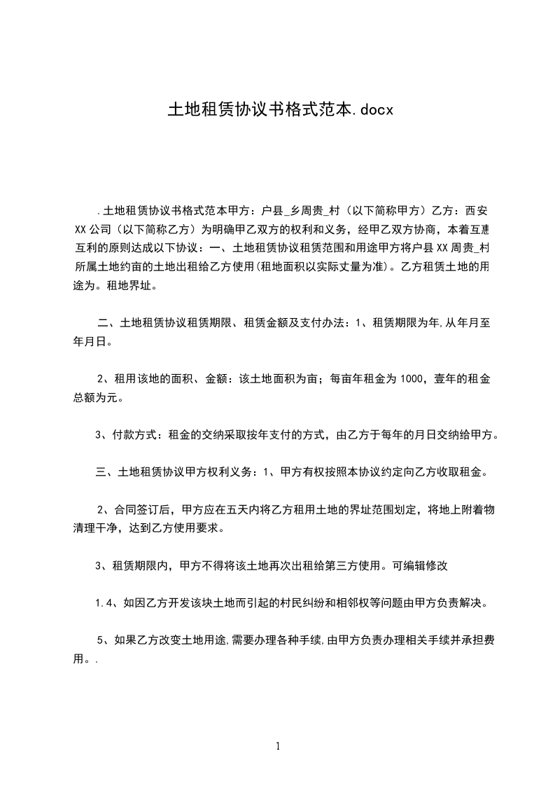 .土地租赁协议书格式范本甲方:户县_乡周贵_村(以下简称甲方)乙方:西安XX公司(以下简称乙方)为明确甲乙双方的权利和义务,经甲乙双方协商,本着互惠互利的原则达成以下协议:一、土地租赁协议租赁范围和用途甲方将户县XX周贵_村所属土地约亩的土地出租给乙方使用(租地面积以实际丈量为准)。乙方租赁土地的用途为。租地界址。