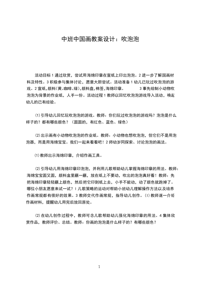 三、请幼儿欣赏自己的作品,鼓励幼儿发挥想象,说一说吹出的泡泡画像什么(圆圆的泡泡像气球、像皮球等等)温馨提示:本次活动重难点是将吹出的泡泡轻轻地放在画纸上,并留下彩色泡泡。延伸活动:投放材料于美工区,请幼儿继续创作。