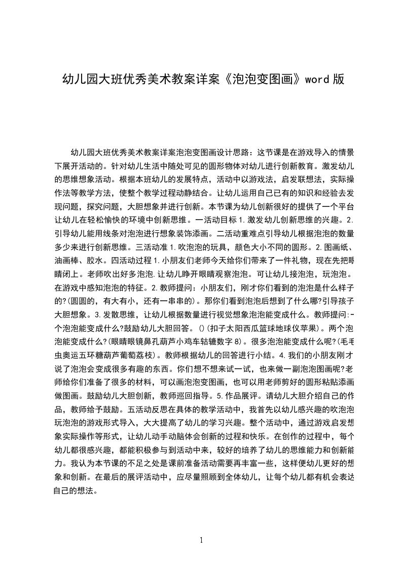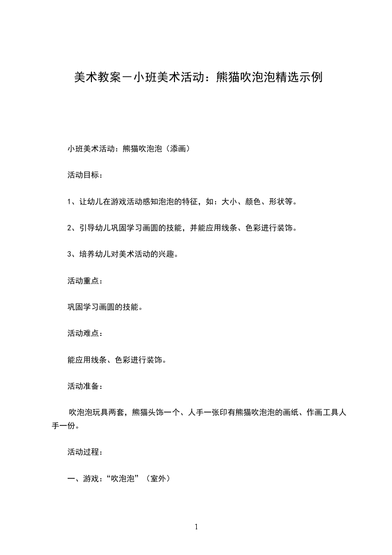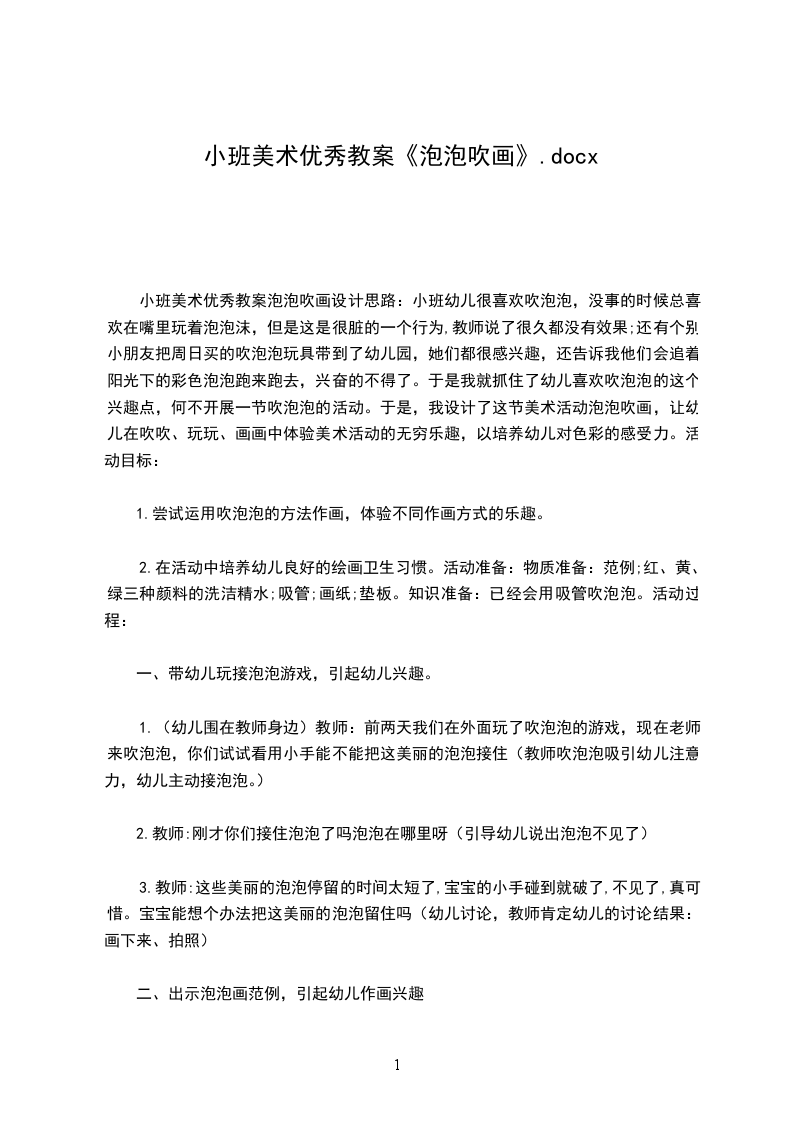 小班美术优秀教案泡泡吹画设计思路:小班幼儿很喜欢吹泡泡,没事的时候总喜欢在嘴里玩着泡泡沫,但是这是很脏的一个行为,教师说了很久都没有效果;还有个别小朋友把周日买的吹泡泡玩具带到了幼儿园,她们都很感兴趣,还告诉我他们会追着阳光下的彩色泡泡跑来跑去,兴奋的不得了。于是我就抓住了幼儿喜欢吹泡泡的这个兴趣点,何不开展一节吹泡泡的活动。于是,我设计了这节美术活动泡泡吹画,让幼儿在吹吹、玩玩、画画中体验美术活动的无穷乐趣,以培养幼儿对色彩的感受力。活动目标: