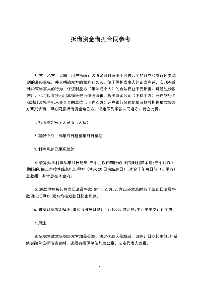 甲方:乙方:日期:用户指南:该协议资料适用于通过合同的订立和履行所要达到的最终目标,并且明确双方的权利和义务,便于保护当事人的正当利益,实现有效地约束当事人的行为,保证利益方(集体或个人)的合法权益不受损害。可通过修改使用,也可以直接沿用本模板进行快速编辑。拆出资金公司(下称甲方)开户银行名称地址及帐号拆入资金金融单位(下称乙方)开户银行名称地址及帐号担保单位经双方研究协商,甲方同意拆借资金给乙方,议定下列条款共同遵守。特立此据。