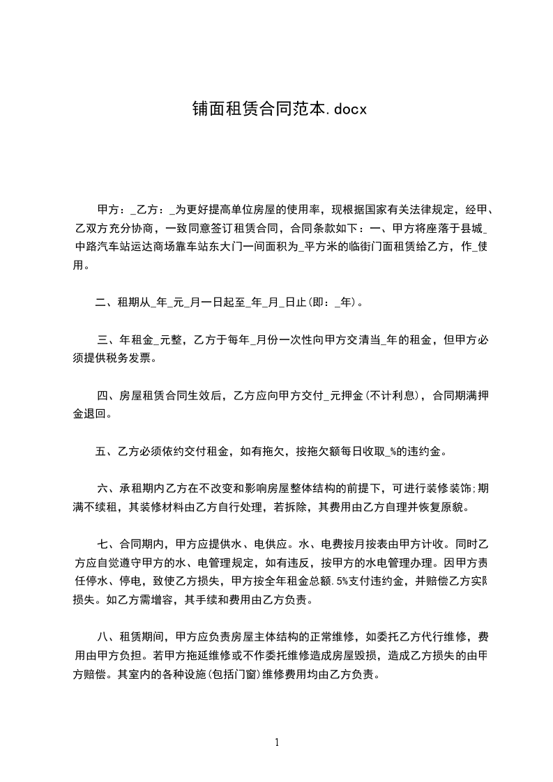 甲方:_乙方:_为更好提高单位房屋的使用率,现根据国家有关法律规定,经甲、乙双方充分协商,一致同意签订租赁合同,合同条款如下:一、甲方将座落于县城_中路汽车站运达商场靠车站东大门一间面积为_平方米的临街门面租赁给乙方,作_使用。