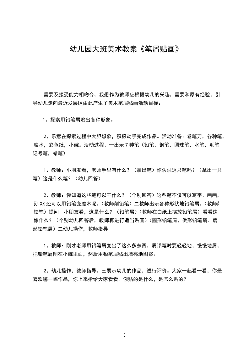 2、教师:你知道这些笔可以干什么?(个别回答)这些笔不仅可以写字、画画,孙XX还可以用铅笔变魔术呢。(教师削铅笔)二教师出示各种形状地铅笔屑。(教师削铅笔)提问:小朋友看,这是什么?(铅笔屑)(教师在白纸上摆放铅笔屑)看看这像什么?(个别幼儿回答后,教师再进行适当贴画)(圆形铅笔屑、供形铅笔屑、扇形铅笔屑)二幼儿操作,教师指导
