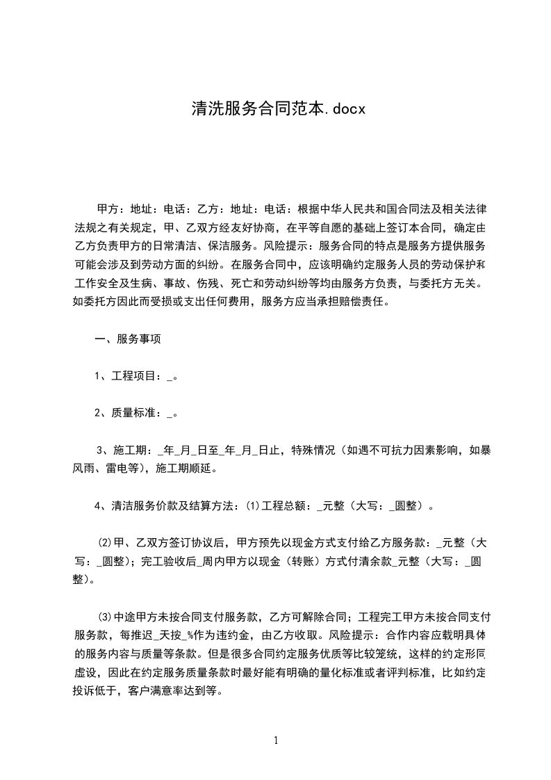 甲方:地址:电话:乙方:地址:电话:根据中华人民共和国合同法及相关法律法规之有关规定,甲、乙双方经友好协商,在平等自愿的基础上签订本合同,确定由乙方负责甲方的日常清洁、保洁服务。风险提示:服务合同的特点是服务方提供服务,可能会涉及到劳动方面的纠纷。在服务合同中,应该明确约定服务人员的劳动保护和工作安全及生病、事故、伤残、死亡和劳动纠纷等均由服务方负责,与委托方无关。如委托方因此而受损或支出任何费用,服务方应当承担赔偿责任。