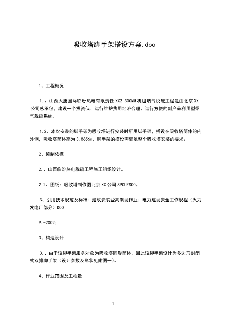 8.1工程简介2#140万吨/年催化裂化装置烟气脱硫脱硝项目由我公司负责。其中急冷吸收塔配合搭设脚手架,外部脚手架用于分段组装焊接作业,内部脚手架用于焊缝酸洗作业;塔器高度68m最大直径6m,为了搭设架子的安全、质量编制脚手架搭拆方案。