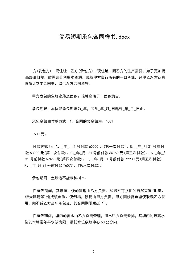 方(发包方):现住址:乙方(承包方):现住址:因乙方的生产需要,为了更加提高经济效益,故需充分利用水资源,现就甲方自行所有的一口鱼塘,经甲乙双方认真协商订立本合同书,以供双方共同遵守。