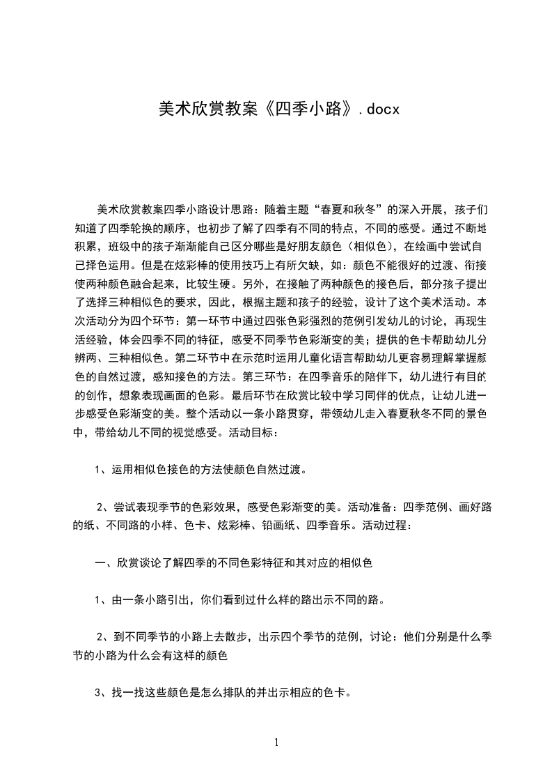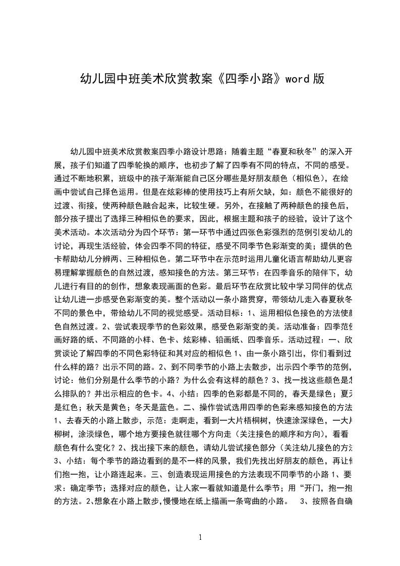 美术欣赏教案四季小路设计思路:随着主题“春夏和秋冬”的深入开展,孩子们知道了四季轮换的顺序,也初步了解了四季有不同的特点,不同的感受。通过不断地积累,班级中的孩子渐渐能自己区分哪些是好朋友颜色(相似色),在绘画中尝试自己择色运用。但是在炫彩棒的使用技巧上有所欠缺,如:颜色不能很好的过渡、衔接,使两种颜色融合起来,比较生硬。另外,在接触了两种颜色的接色后,部分孩子提出了选择三种相似色的要求,因此,根据主题和孩子的经验,设计了这个美术活动。本次活动分为四个环节:第一环节中通过四张色彩强烈的范例引发幼儿的讨论,再现生活经验,体会四季不同的特征,感受不同季节色彩渐变的美;提供的色卡帮助幼儿分辨两、三种相似色。第二环节中在示范时运用儿童化语言帮助幼儿更容易理解掌握颜色的自然过渡,感知接色的方法。第三环节:在四季音乐的陪伴下,幼儿进行有目的的创作,想象表现画面的色彩。最后环节在欣赏比较中学习同伴的优点,让幼儿进一步感受色彩渐变的美。整个活动以一条小路贯穿,带领幼儿走入春夏秋冬不同的景色中,带给幼儿不同的视觉感受。活动目标: