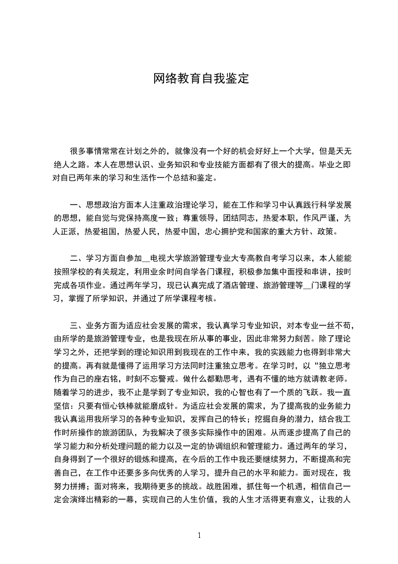 三、业务方面为适应社会发展的需求,我认真学习专业知识,对本专业一丝不苟,由所学的是旅游管理专业,也是我现在所从事的事业,因此非常努力刻苦。除了理论学习之外,还把学到的理论知识用到我现在的工作中来,我的实践能力也得到非常大的提高。再有就是懂得了运用学习方法同时注重独立思考。在学习时,以“独立思考”作为自己的座右铭,时刻不忘警戒。做什么都勤思考,遇有不懂的地方就请教老师。随着学习的进步,我不止是学到了专业知识,我的心智也有了一个质的飞跃。我一直坚信:只要有恒心铁棒就能磨成针。为适应社会发展的需求,为了提高我的业务能力,我认真运用我所学习的各种专业知识,发挥自己的特长;挖掘自身的潜力,结合我工作时所操作的旅游团队,为我解决了很多实际操作中的困难。从而逐步提高了自己的学习能力和分析处理问题的能力以及一定的协调组织和管理能力。通过两年的学习,自身得到了一个很好的锻炼和提高,在今后的工作中我还要继续努力,不断提高和完善自己,在工作中还要多多向优秀的人学习,提升自己的水平和能力。面对现在,我努力拼搏;面对将来,我期待更多的挑战。战胜困难,抓住每一个机遇,相信自己一定会演绎出精彩的一幕,实现自己的人生价值,我的人生才活得更有意义,让我的人生绽放出七彩的光芒。网络教育自我鉴定20__年_月进入现代__专业学习,两年半时间里,我主要学习了管理学原理、工程经济学、工程项目管理和工程结构等课程,通过这__的学习,我收获颇丰。首先,我抓住一切可利用的时间来学习,并制定了详细的学习计划,大大提高了学习效率。我是一名建筑公司项目经理,平时工作繁忙,很难有固定的学习时间。但远程教育这种新型的教育方式,借助先进的信息传输技术,突破了时空限制,使我能更合理自由地安排学习时间。平时,我充分利用午休时间、下班后的时间来学习,抓住一切可利用的零碎时间在网上查阅课件,和老师、同学进行交流,并不断思考和总结,学习效率提高了,专业知识也丰富了。其次,我注重学以致用,把学到的新知识及时运用到实际工作中,以此指导工作。我深知,工程管理专业是一个实践性较强的专业,如果不及时把学到的知识与实际工程管理相结合,那么将很难达到课程预定的效果。因此,我总是把学到的新知识及时运用到实际工程管理中,并及时纠正与更新原先的工程管理思想与方法,日积月累,我的专业知识和实践技能均得到了显著提高。最后,在学习过程中,我经常和老师、同学通过电子邮件等形式进行交流,增强了学习的主动性和自主性。远程教育主要是依靠自学,我充分利用业余时间学习各门课程,将所学知识进行系统梳理,把自学中遇到的疑难问题详细记录下来,并及时向老师请教,与同学交流。在这一过程中,学习的主动性和自主性有了很大的提高。通过远程教育,我的专业知识丰富了,同时多方面的能力得到了长足锻炼,如学习效率提高了,学习的主动性和自主性增强了,各方面均真正达到了本科水平,并具备了一名项目经理和企业领导应有的素质。在以后的工作中,我会把学到的知识充分运用到施工管理中,并不断加强学习,使自己的管理水平不断迈上新台阶。网络教育自我鉴定三以下是我对求学_年时间做的自我鉴定。