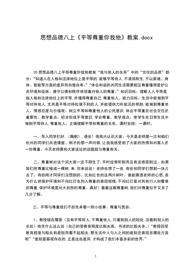 20思想品德八上我知我家教案“相亲相爱一家人”教学计划及教案教学目标:通过教学使学生在不断扩展的社会生活中,学会与各种各样的人打交道,学会交往,提升学生的道德水平,增强学生的出世能力,促进自身的健康发展,学会与家长交往,学会与家长沟通,学会产生矛盾和冲突时,找出化解的最好方法。教学重点:家庭关系的确立;认识自己家庭的能力;领悟父母的爱心;学会孝敬父母;领悟父母的爱心;学会孝敬父母;逆反心理的具体表现和造成的实际危害;与父母沟通的基本要领和主要策略。教学难点:家庭关系的确立;如何孝敬父母:如何孝敬父母;产生代沟的直接原因和实质;与父母的沟通能力。教学方法;讲授法、讨论法、自学法、练习法。教学课时:共计5课时第一课时我知我家教学目标:知识目标:了解家庭的一般概况;家庭关系的确立;子女与父母的关系不可选择;了解父母的特点;家人的优秀品质。能力目标:认识自己家庭的能力。情感、态度、价值观目标:爱自己的家、热爱父母的情感和厌恶不孝行经的情感。重点:家庭关系的确立;认识自己家庭的能力。难点:家庭关系的确立。导入新课:有了泥土,嫩芽才会长大;有了阳光,春芽才会开花;我们每个人的成长都离不开我们的家。当我们还在妈妈肚子里的时候,爱我们的爸爸、妈妈、爷爷、奶奶就开始为我们绘制宏伟的蓝图,编制美丽的理想甚至为我们早早起好了名字。有没有同学愿意为大家介绍一下你们名字的含义呀学生答略,教师引导:是呀,我们从出生那一刻起,就被父母的爱和温暖所包围。