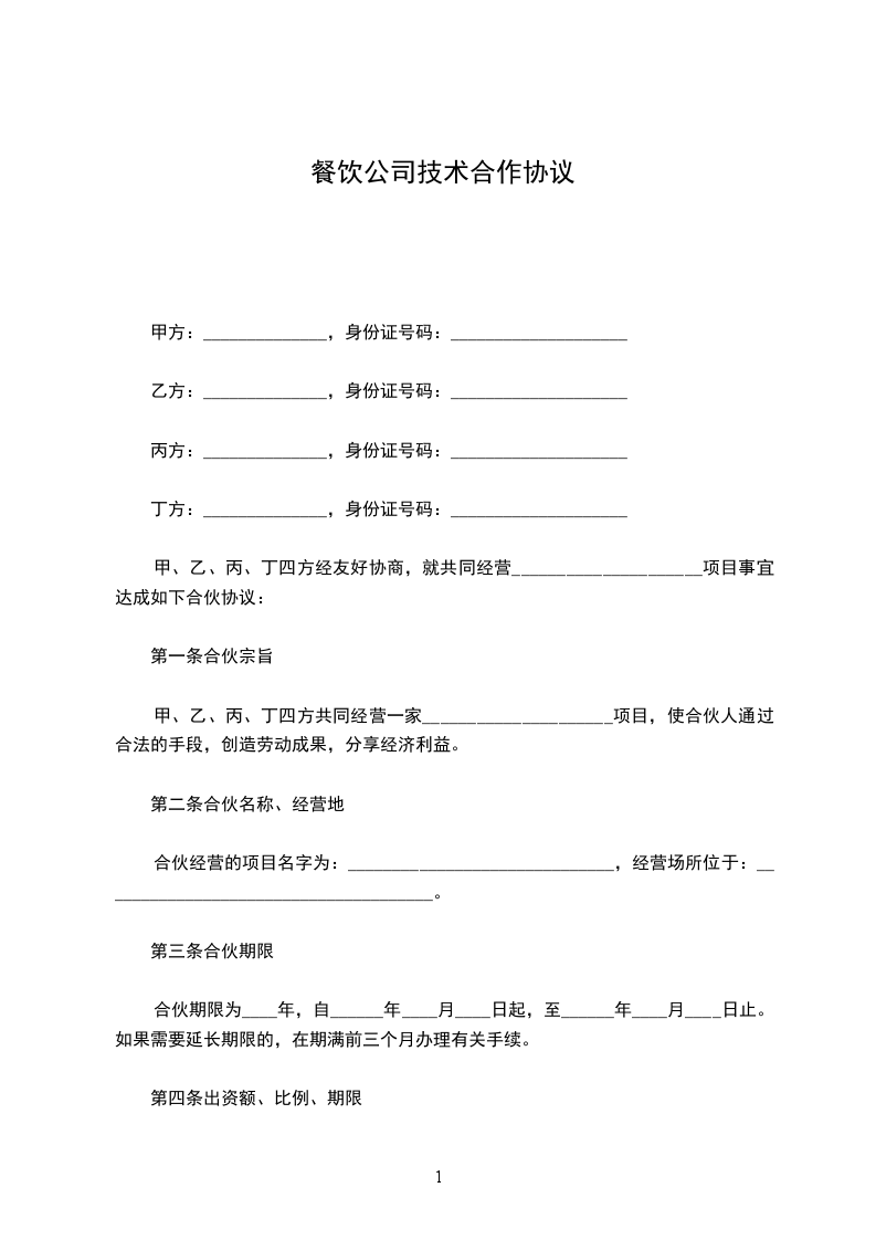 甲、乙、丙、丁四方经友好协商,就共同经营_____________________项目事宜达成如下合伙协议: