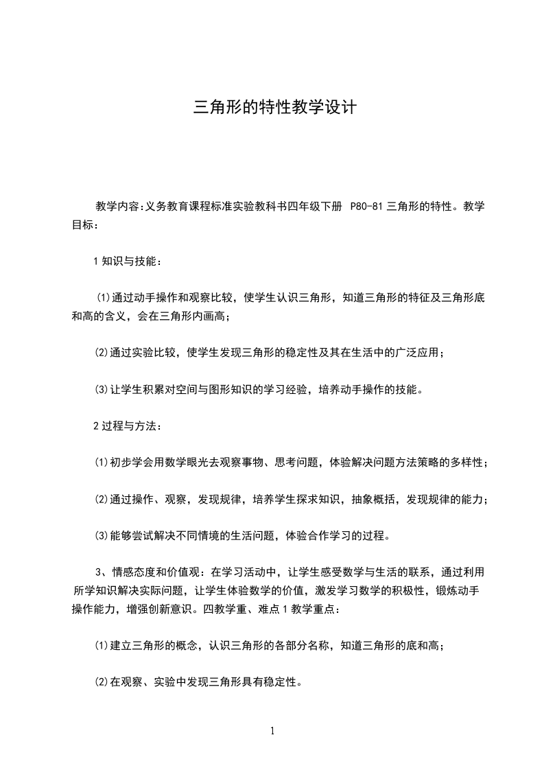 教学内容:义务教育课程标准实验教科书四年级下册P80-81三角形的特性。教学目标:
