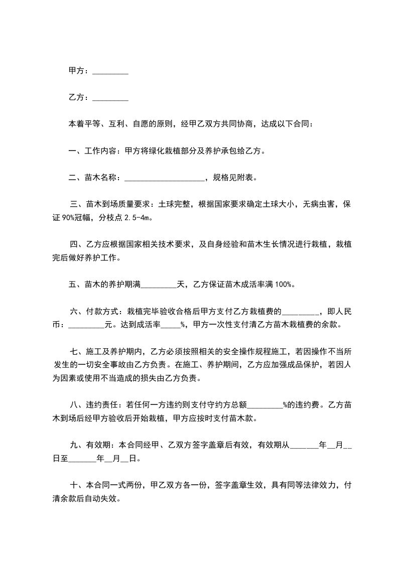 四、乙方应根据国家相关技术要求,及自身经验和苗木生长情况进行栽植,栽植完后做好养护工作。