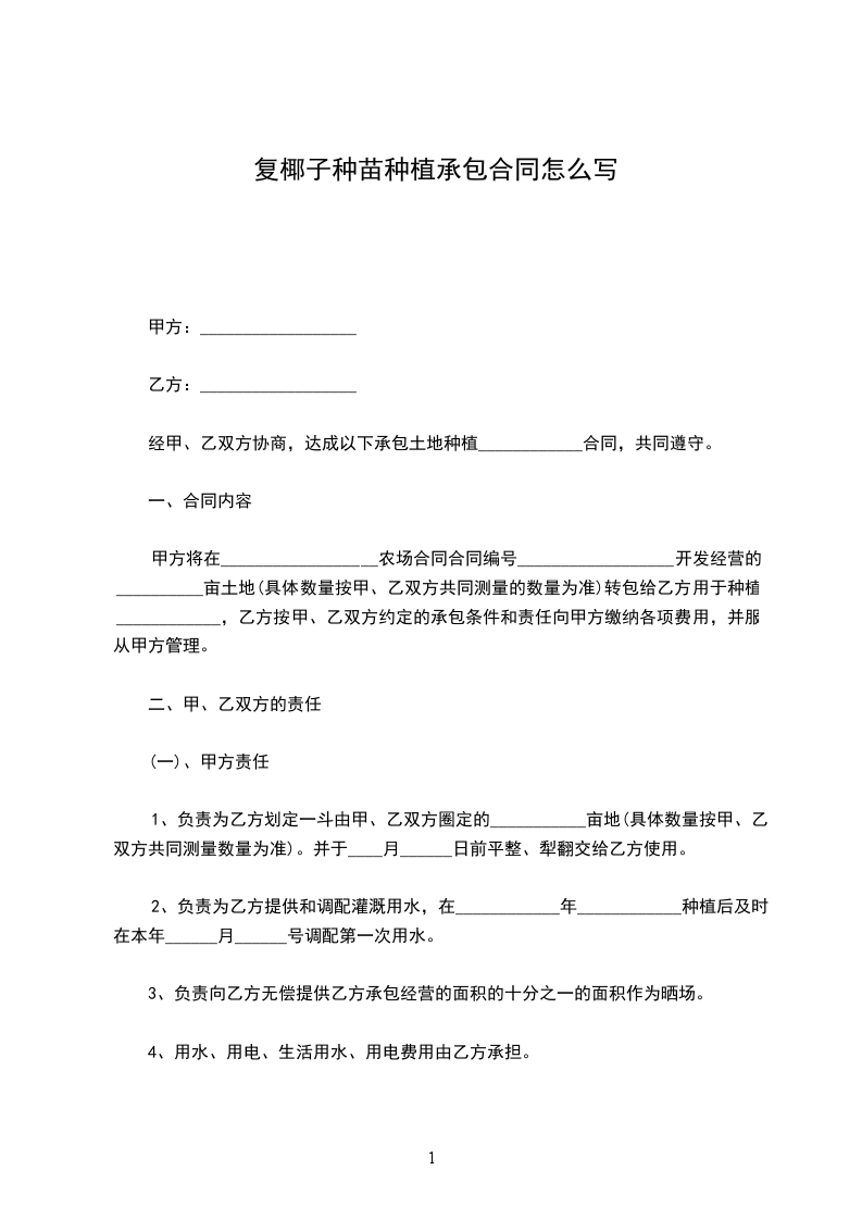 甲方将在__________________农场合同合同编号__________________开发经营的__________亩土地(具体数量按甲、乙双方共同测量的数量为准)转包给乙方用于种植____________,乙方按甲、乙双方约定的承包条件和责任向甲方缴纳各项费用,并服从甲方管理。