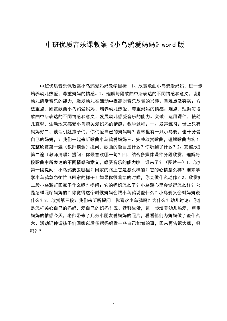 4、能大胆、清晰地表达自己的见解,体验成功的欢乐。重难点及突破方法重点:观赏歌曲小乌鸦爱妈妈,培育幼儿热爱,敬重妈妈的情感。难点:理解每段歌曲中所表达的不同情感和意义,发展幼儿感受音乐的能力。突破:运用课件,使幼儿直观,生动地来感受小乌鸦关爱妈妈的情感。教学过程